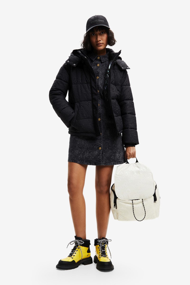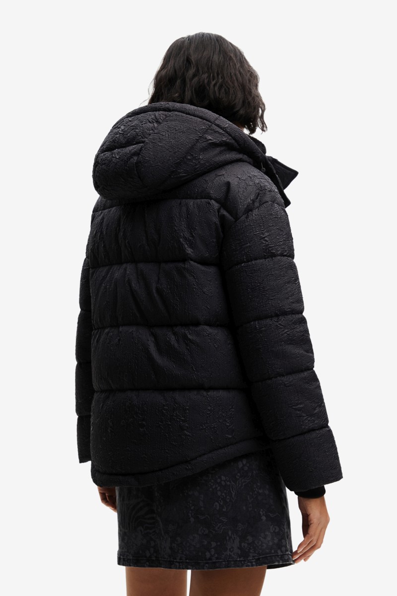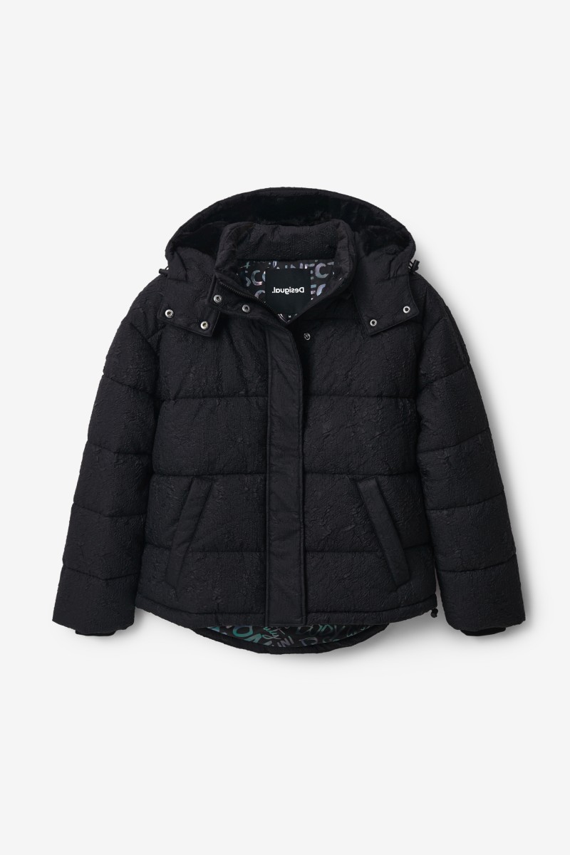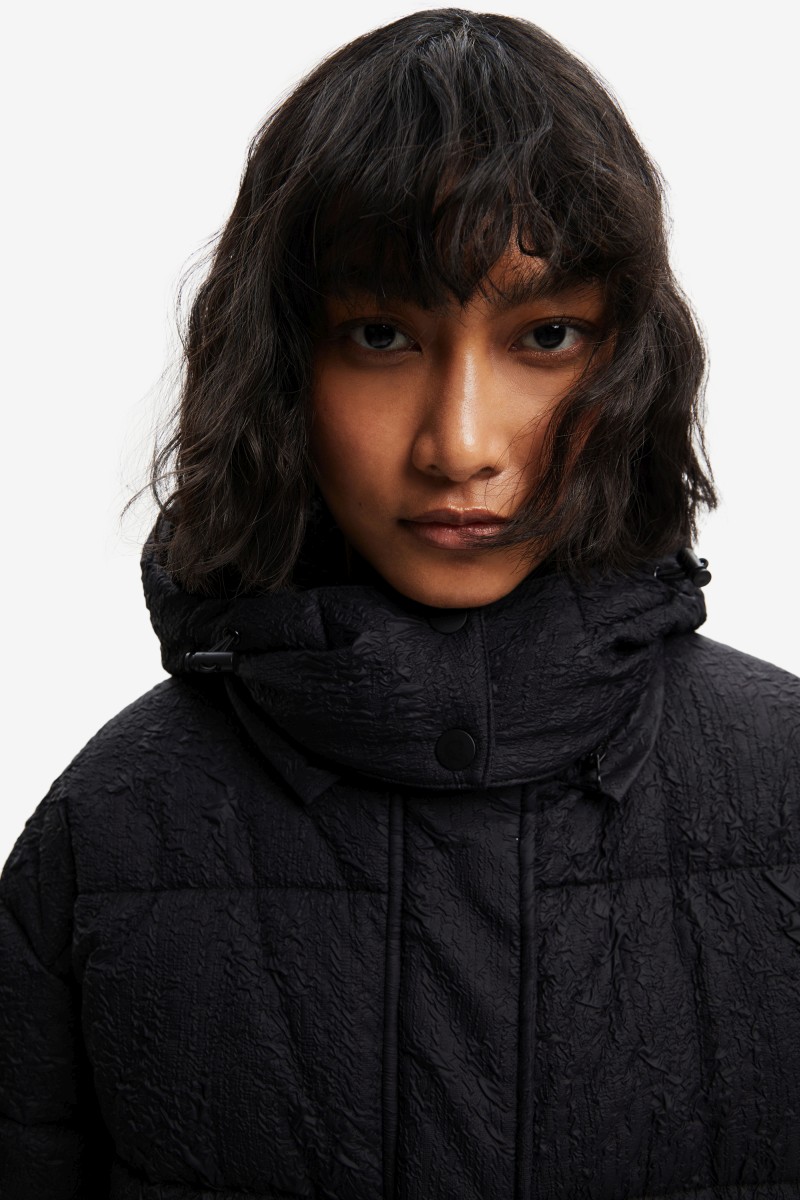 Tato prošívaná bunda je pohodlná a teplá, má kapuci, povrchovou úpravu z recyklovaných vláken a reliéfní abstraktní potisk.