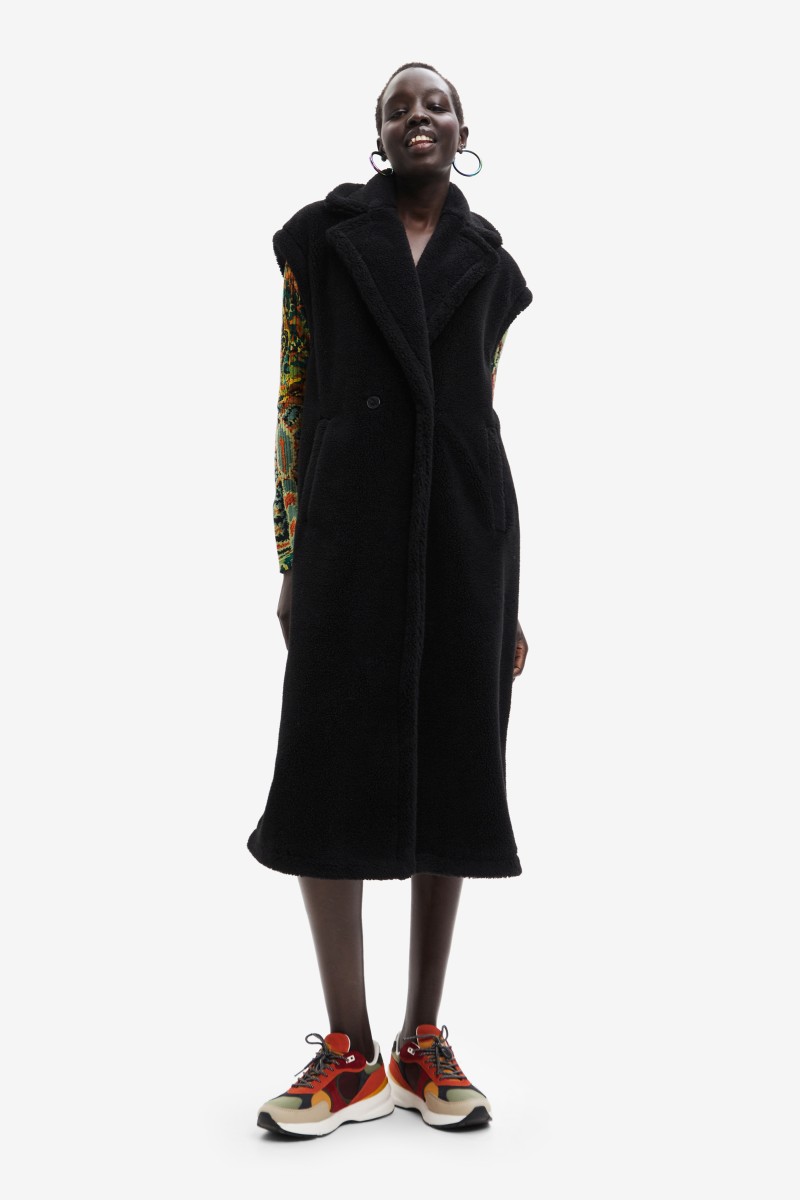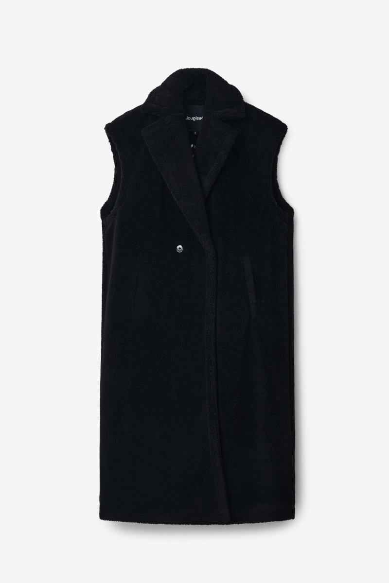 This vest is made of a warm wool fabric with a pleasant touch, it does not go unnoticed and is very easy to combine thanks to its straight cut, long length and collar with lapels.