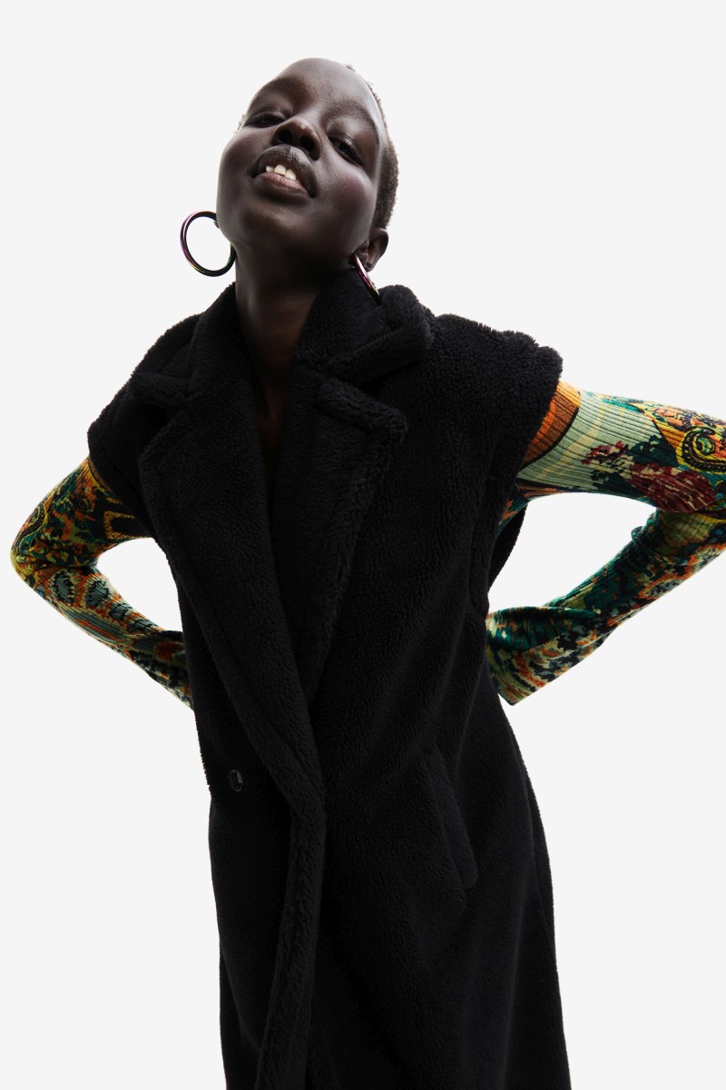 Tato vesta je vyrobena z hřejivé vlněné tkaniny příjemné na dotek, nezůstane bez povšimnutí a díky rovnému střihu, dlouhé délce a límci s klopami se velmi snadno kombinuje.