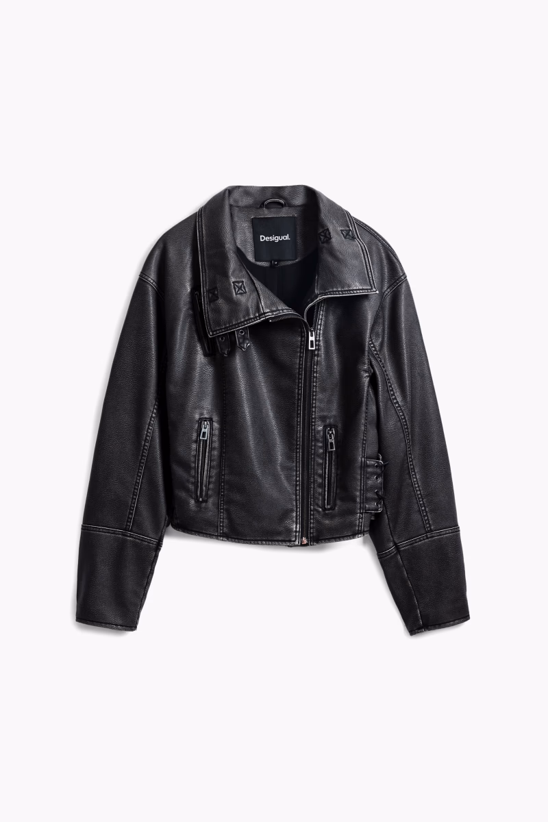 Excessive biker jacket with zipper and slightly increased collar.
