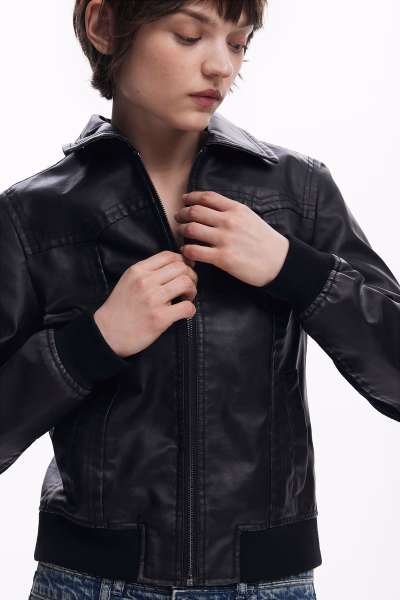 Biker jacket made of leather effect, collar, zip fastening, front pockets and rubber at the waist.