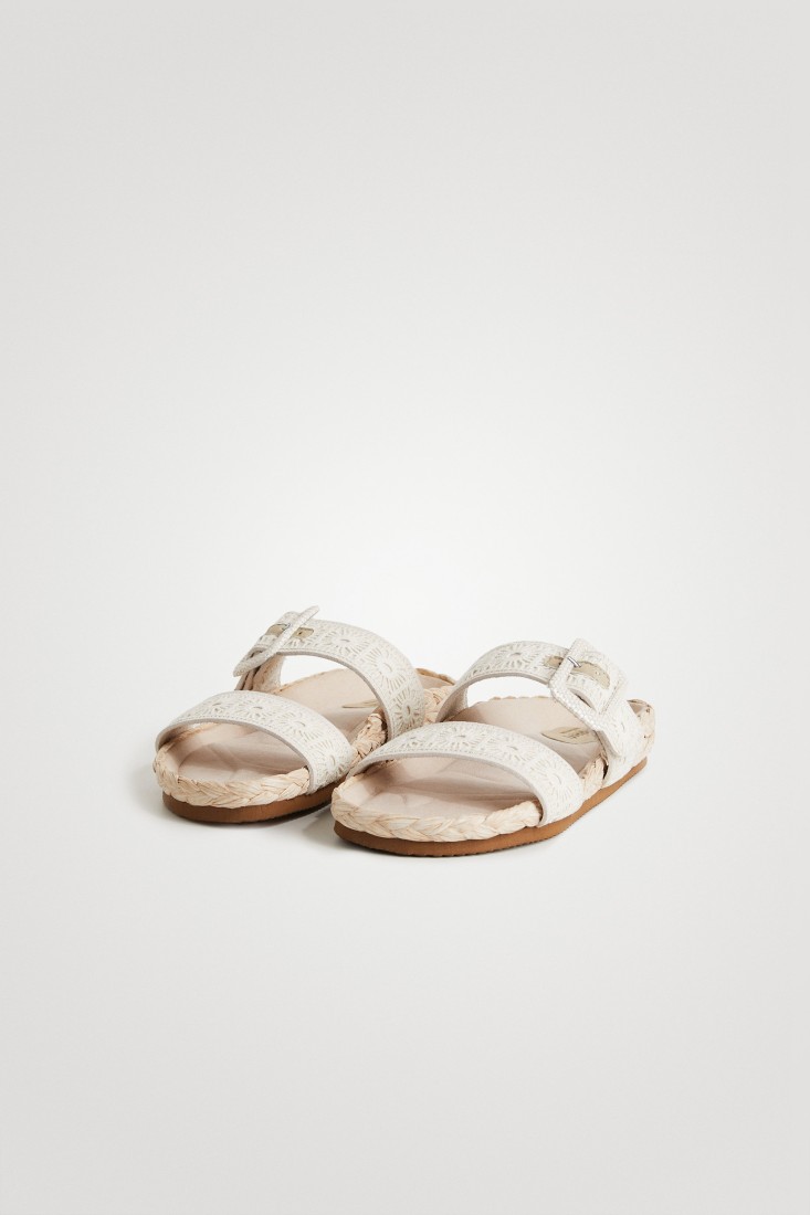 Natural fibers and crochet details give this flat sandal a summer touch. With two wide, very comfortable straps and buckle closure. Padded microfiber sole and braided jute details.