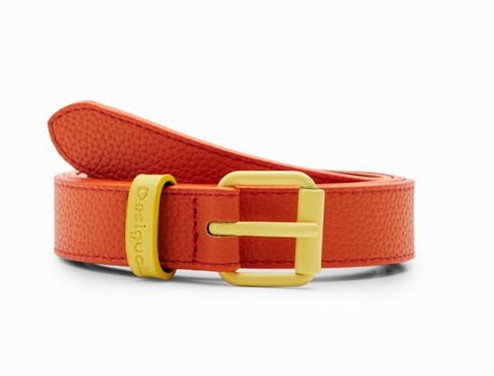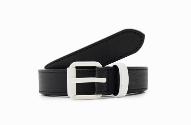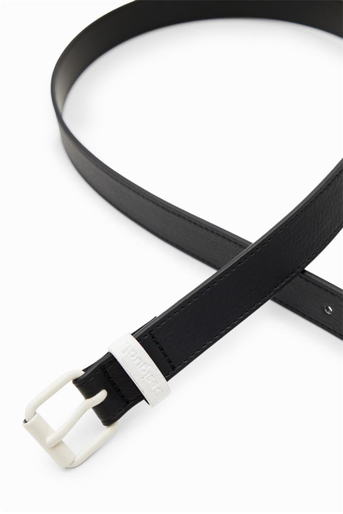 Pásek s efektem hladké kůže s texturou a kontrastní kovovou přezkou.