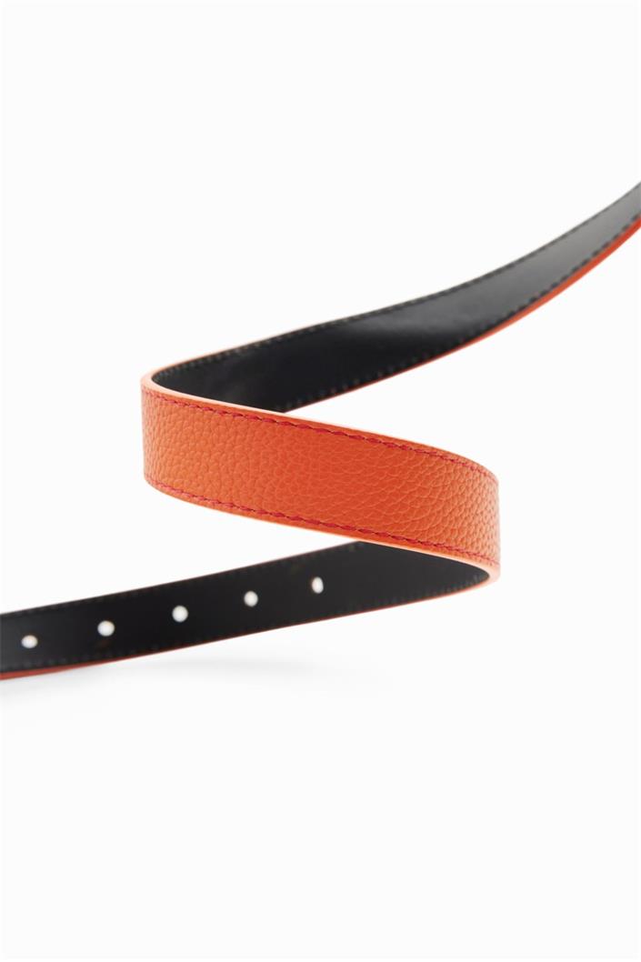 Smooth leather effect belt with texture and contrasting metal buckle.