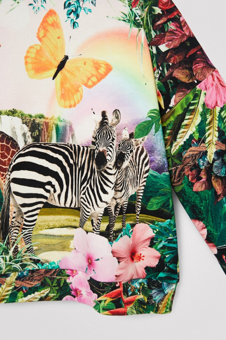 All-over print of a landscape with zebras and giraffes in this hoodie made of sustainable cotton.