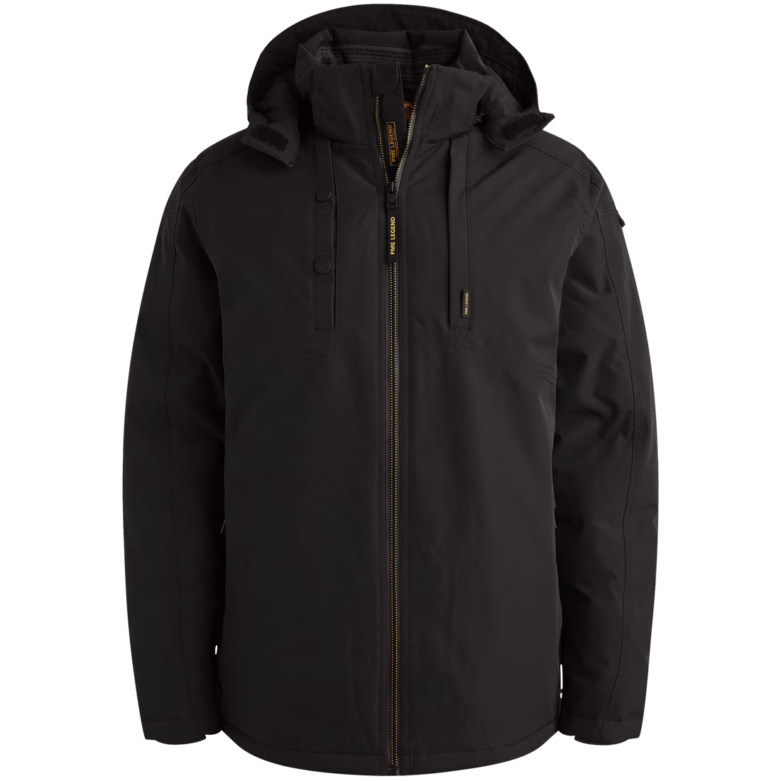 The PME Legend Stearpacker jacket is inspired by an authentic field jacket from 1965. With Tech Down insulation and a removable, adjustable hood, this waterproof jacket is ideal for a variety of weather conditions. Ribbed cuffs and a wind flap with chin guard provide extra warmth and comfort. The jacket has two zippered side pockets with fleece lining, one zippered chest pocket, and two zippered inside pockets. Characteristic PME Legend details, such as the removable sleeve tape, give the jacket its final look.