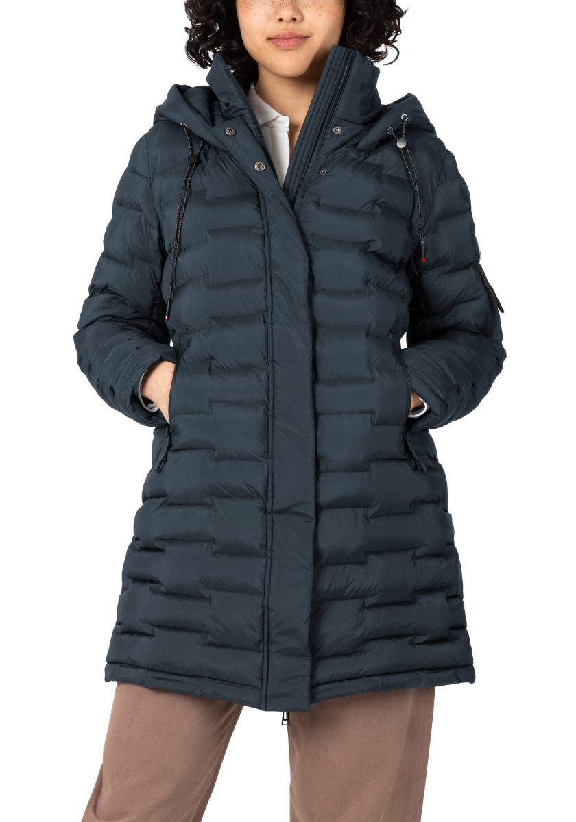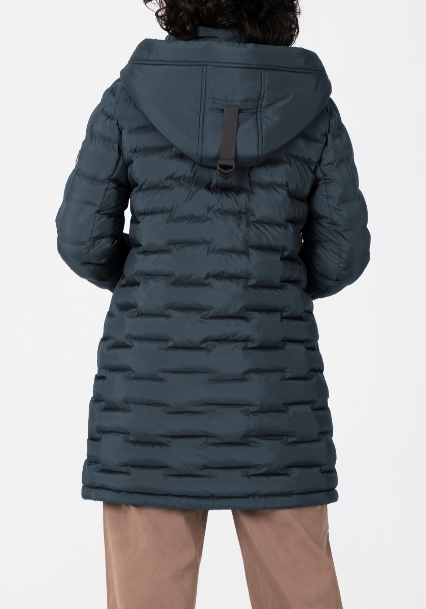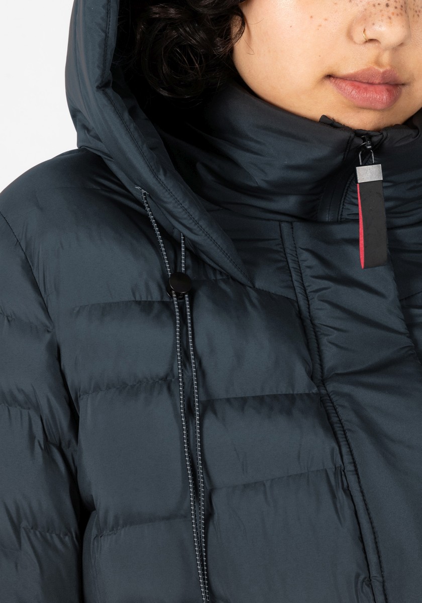 The puffer hooded coat with a double collar solution has a water-repellent surface and new, sophisticated chambers in a staggered look. Model with a large, fixed hood with a drawstring at the edge, a high collar and a concealed two-way waterproof front zipper that does not allow wind or weather to pass through. With two practical zip pockets on the side and one on the arm. Sustainable: The recycled padding is breathable, has a high heat retention capacity and is super light.