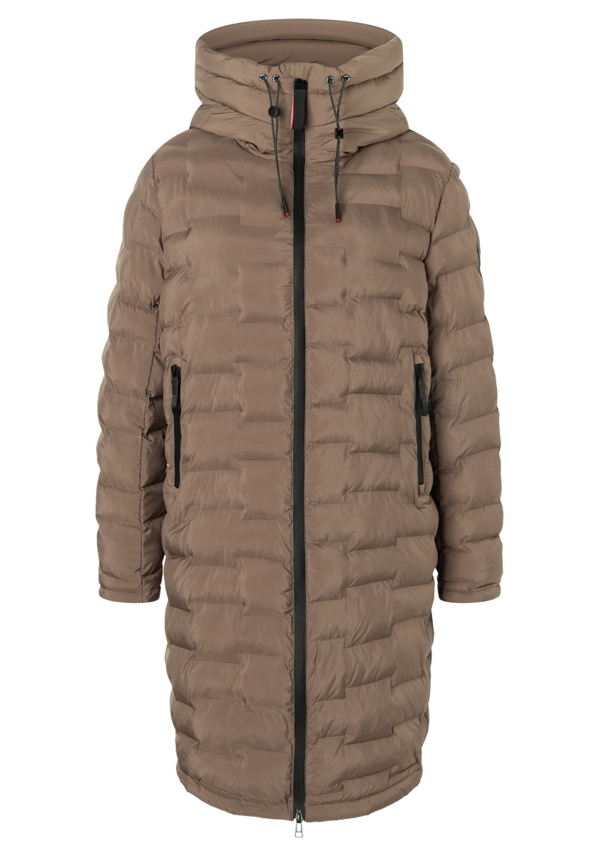 The puffer hooded coat with a double collar solution has a water-repellent surface and new, sophisticated chambers in a staggered look. Model with a large, fixed hood with a drawstring at the edge, a high collar and a concealed two-way waterproof front zipper that does not allow wind or weather to pass through. With two practical zip pockets on the side and one on the arm. Sustainable: The recycled padding is breathable, has a high heat retention capacity and is super light.