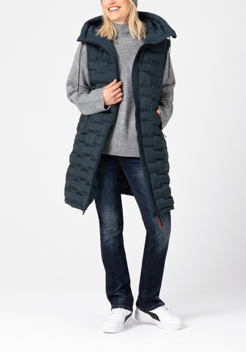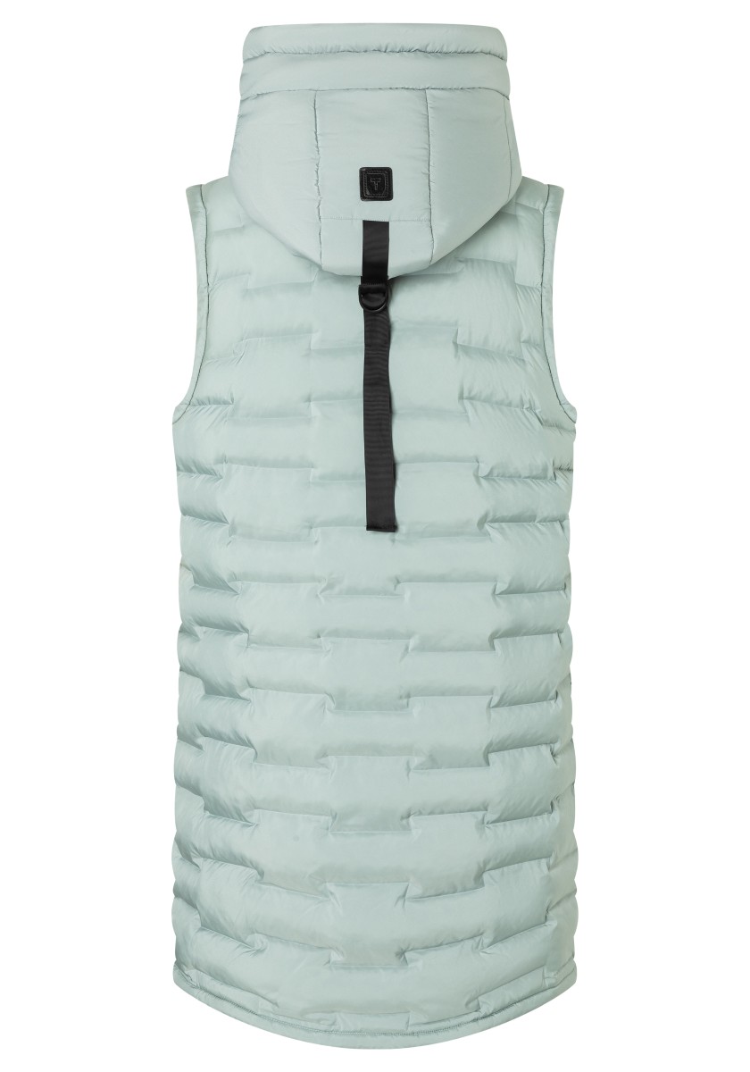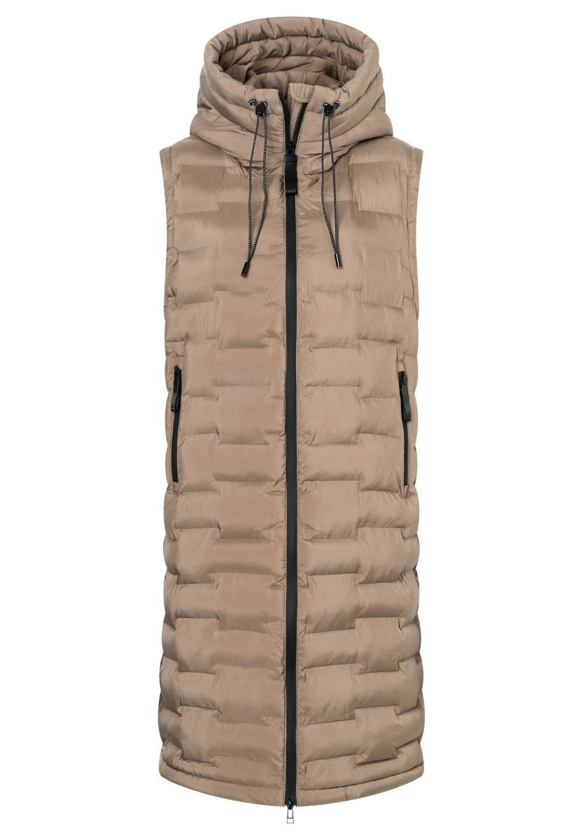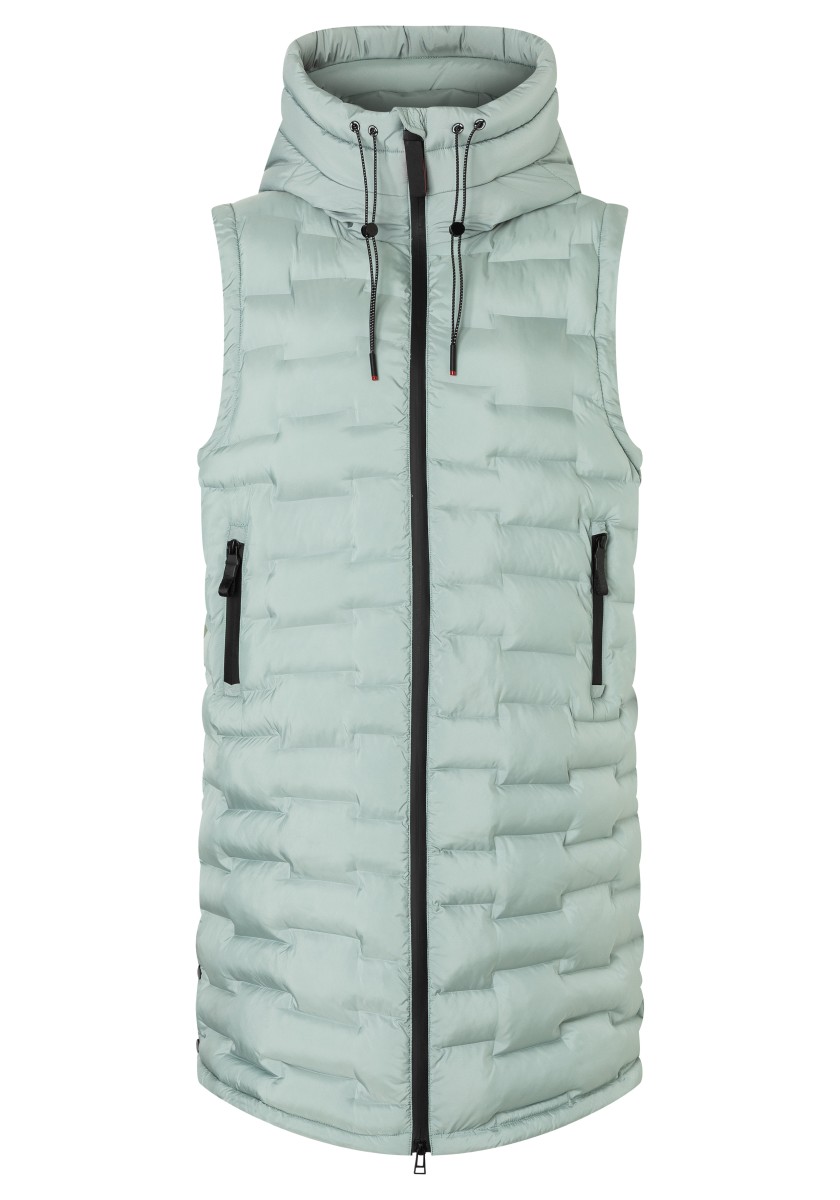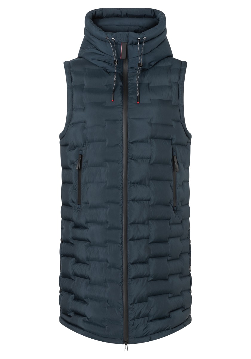 Puffer vest with a water-repellent surface and cleverly bonded chambers in a staggered look. Model with a large, fixed hood with a drawstring at the edge, a high collar and a waterproof two-way waterproof front zipper that does not allow wind or weather to pass through. With two zippered pockets and side seams that can be opened at the hem with press studs. Sustainable: The recycled padding is breathable, has a high heat retention capacity and is super light.