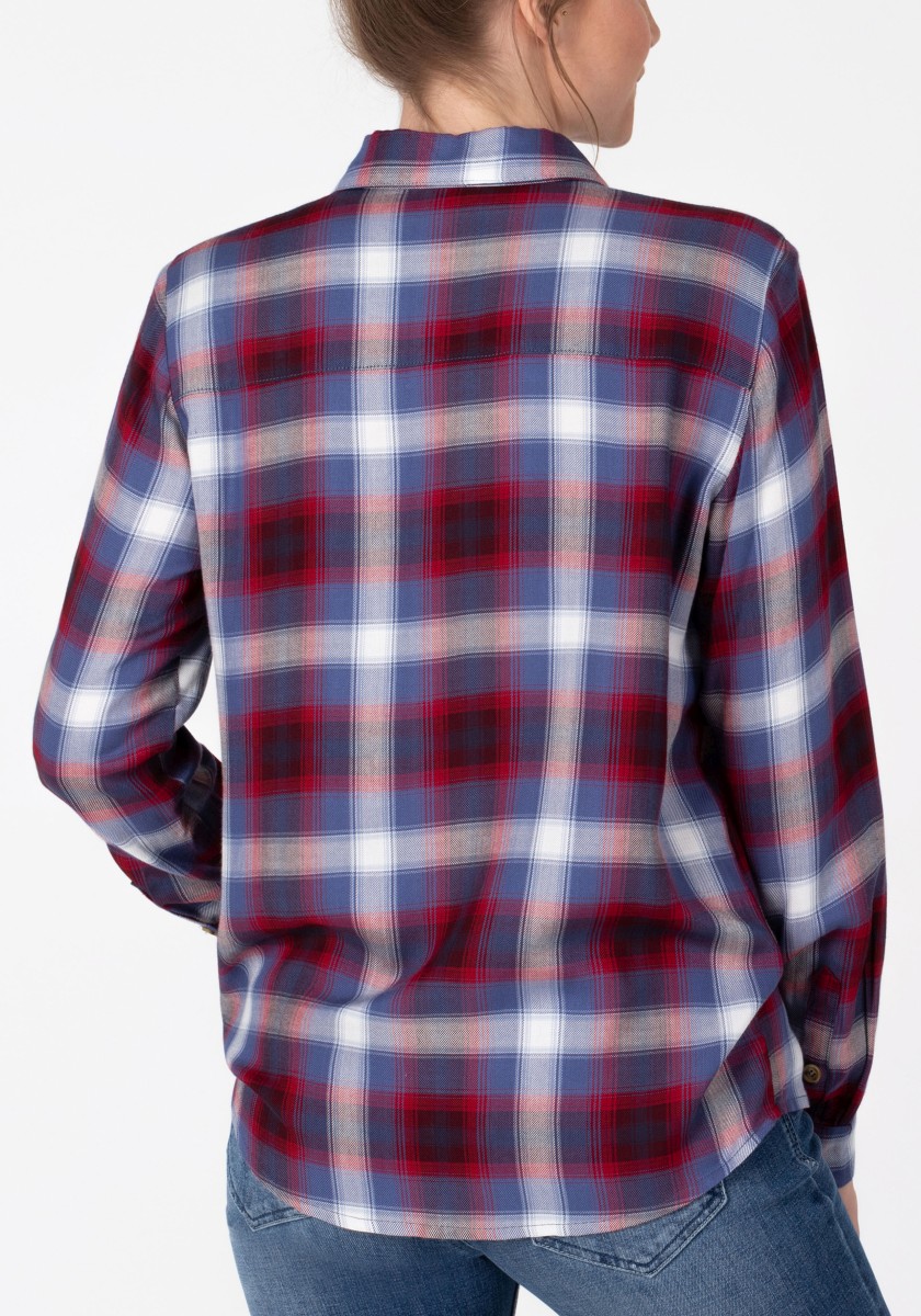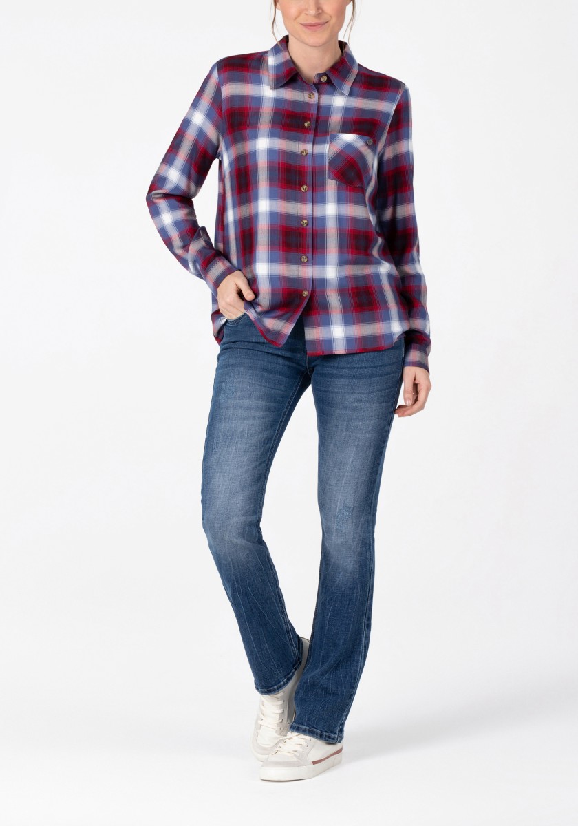 One of the most important fashion trends of the coming season? The boyfriend look. Known from jeans, it's now spilling over into tops. Perfect for this: the super-casual check blouse shirt made of pure, yarn-dyed viscose. Flowing model with Kent collar, back yoke, full-length button placket, a patch breast pocket, classic blouse sleeves and a slightly curved hem line. Styling tip: wear the shirt sometimes as an overshirt or classically under a cool cardigan.