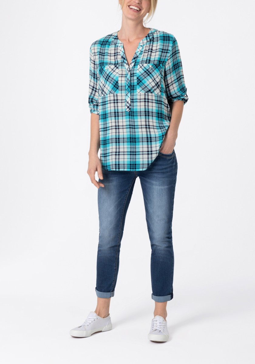 If you think a casual pattern is only in autumn and winter, you are very wrong. Combined with the cool design of the blouse has a summer, light look. Free-cut model made of super soft, squeezed mixtures of modal-chosen with stand and hidden Henley neckline. Ideal for your travel suitcase: No need to iron! 3/4 Sleeves with narrow cuffs and casually rounded lower hem. Rear part with caliper and box fold.