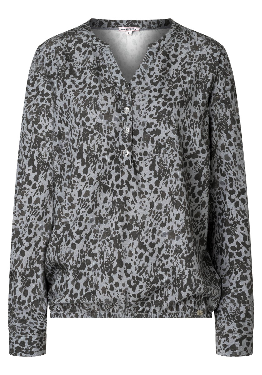 Perfect for the trends of mix of patterns, but can also be combined with monochrome underpants: patterned blouse. Our model is made of clean viscose with sports details. Free cut with stand, V -neck, button fastening and long sleeves with narrow cuffs. Comfortable and casual: Elastic hem gives the blouse a cool silhouette. Styling Tip: Use our long sleeve turtleneck like underwear to make the blouse suitable for winter.