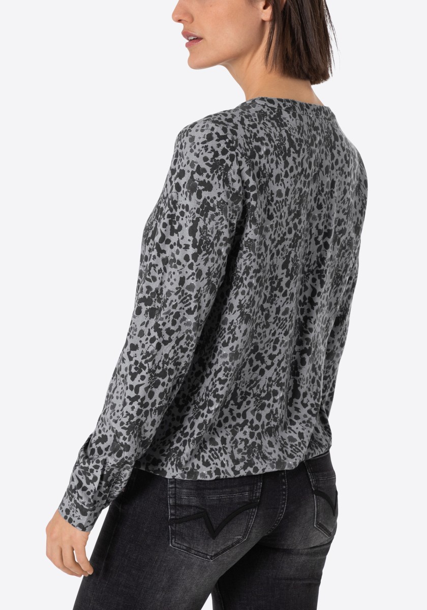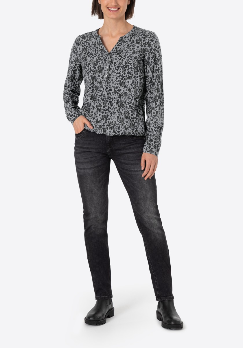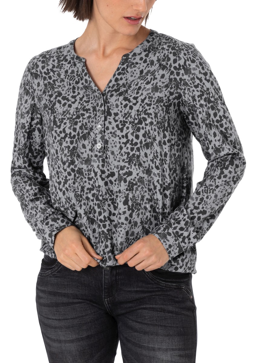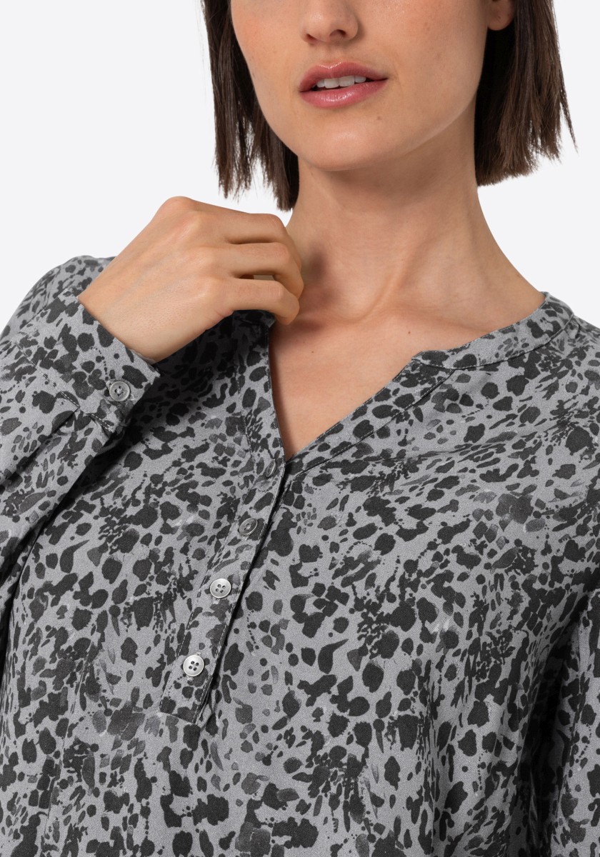 Perfektní pro trendy mix vzorů, ale lze je také kombinovat s jednobarevnými spodky: vzorovanou halenkou. Náš model je vyroben z čisté viskózy se sportovními detaily. Volný střih se stojáčkem, výstřihem do V, zapínáním na knoflíky a dlouhými rukávy s úzkými manžetami. Pohodlné a ležérní: elastický lem dodává halence chladnou siluetu. Stylingový tip: použijte náš rolák s dlouhým rukávem jako spodní prádlo, aby byla halenka vhodná na zimu.