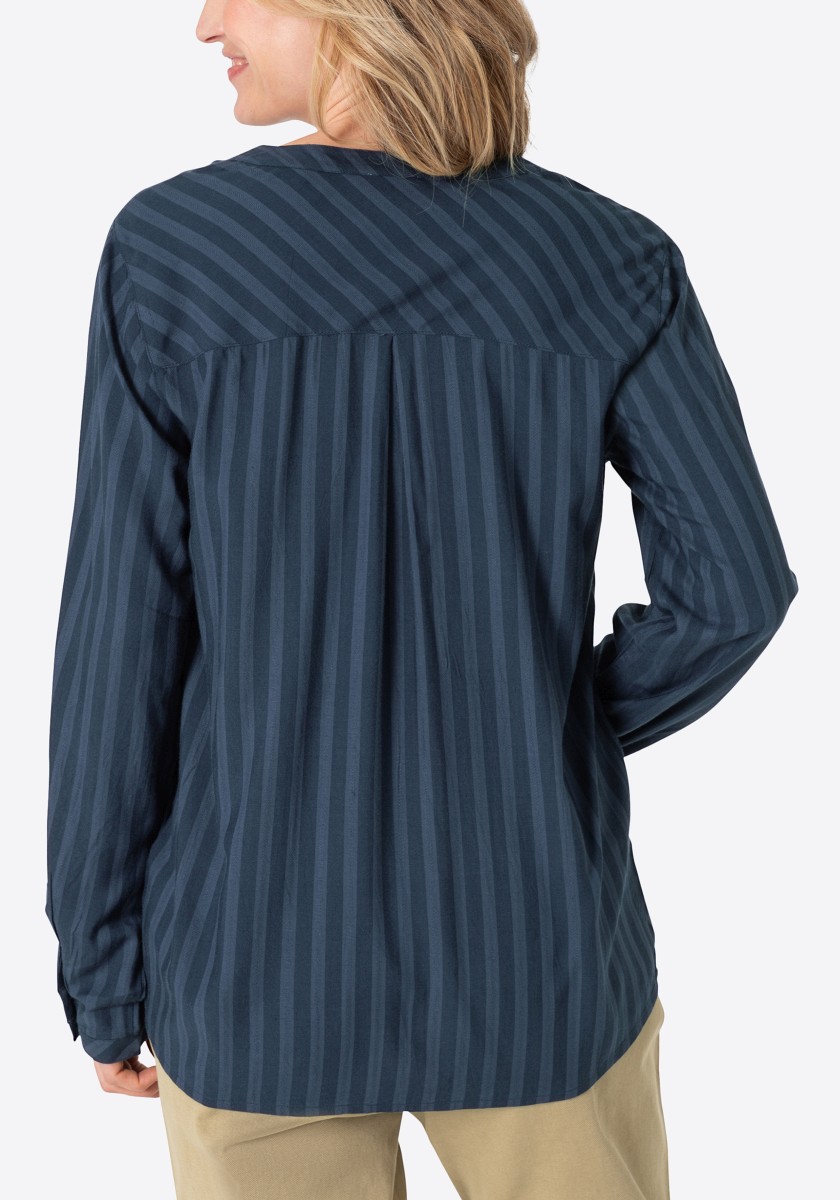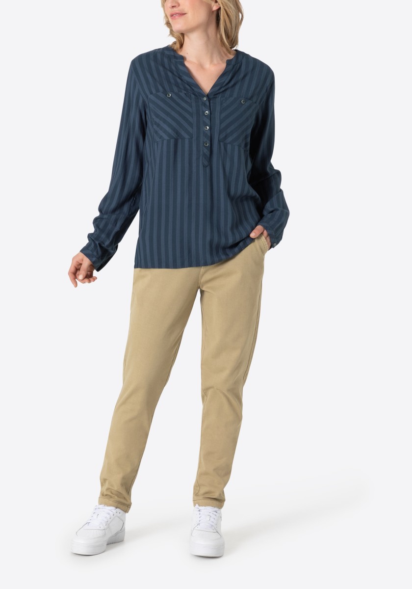 Jsou absolutní klasikou a zároveň nabízejí nepřeberné množství stylingových nápadů: halenky. Sportovní, ležérní slip-on model lze kombinovat v hravém, ženském nebo rockovém a cool stylu. Měkká halenka je vyrobena z čisté, splývavé viskózy a má decentní pruhovaný design barvený přízí s jemným vzorem. Se stojáčkem, výstřihem do V, légou na půl knoflíku, dlouhými rukávy s úzkými manžetami na knoflíky a decentně zaobleným spodním lemem. Zadní díl s ramenním sedlem a krabicovým záhybem.