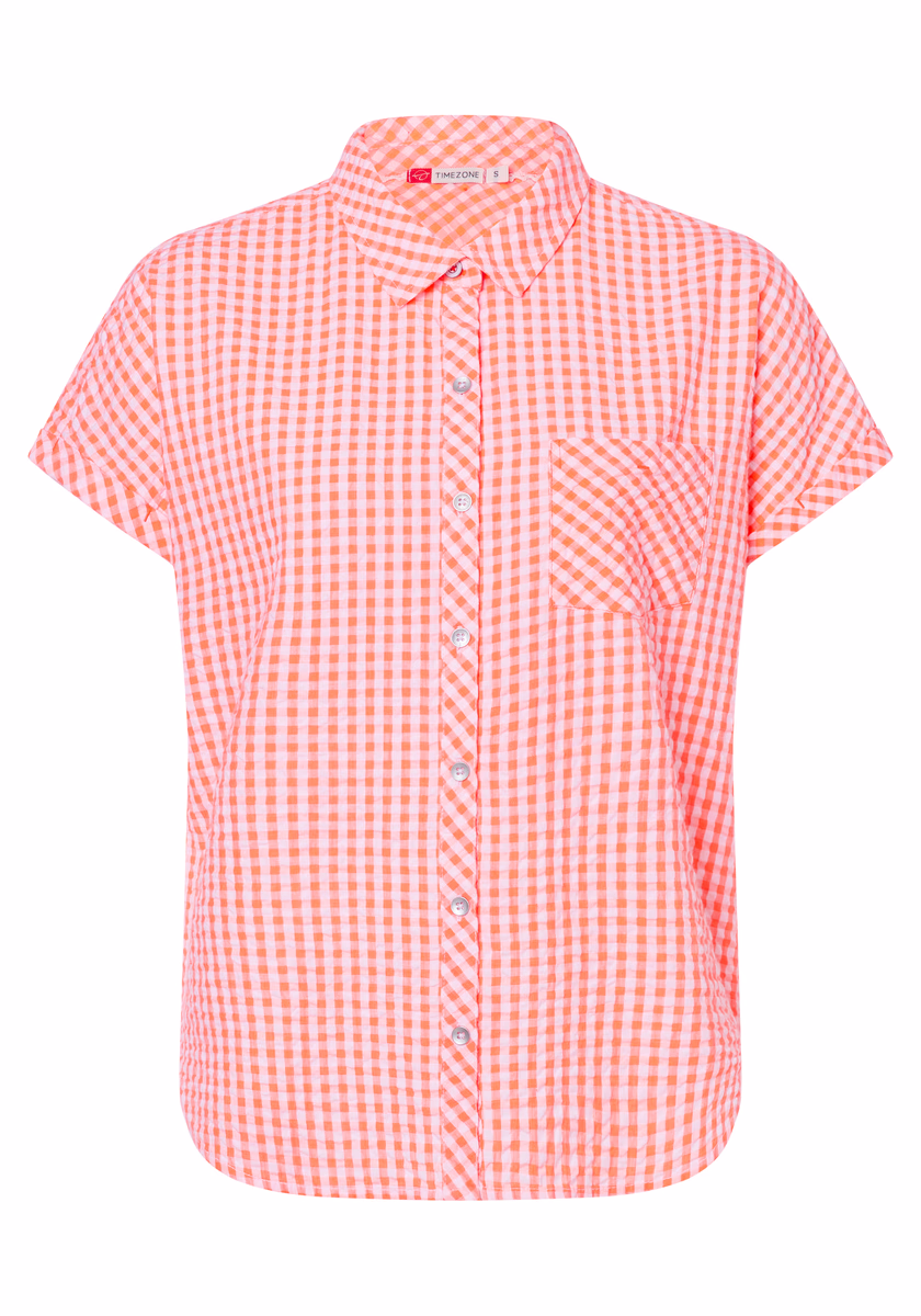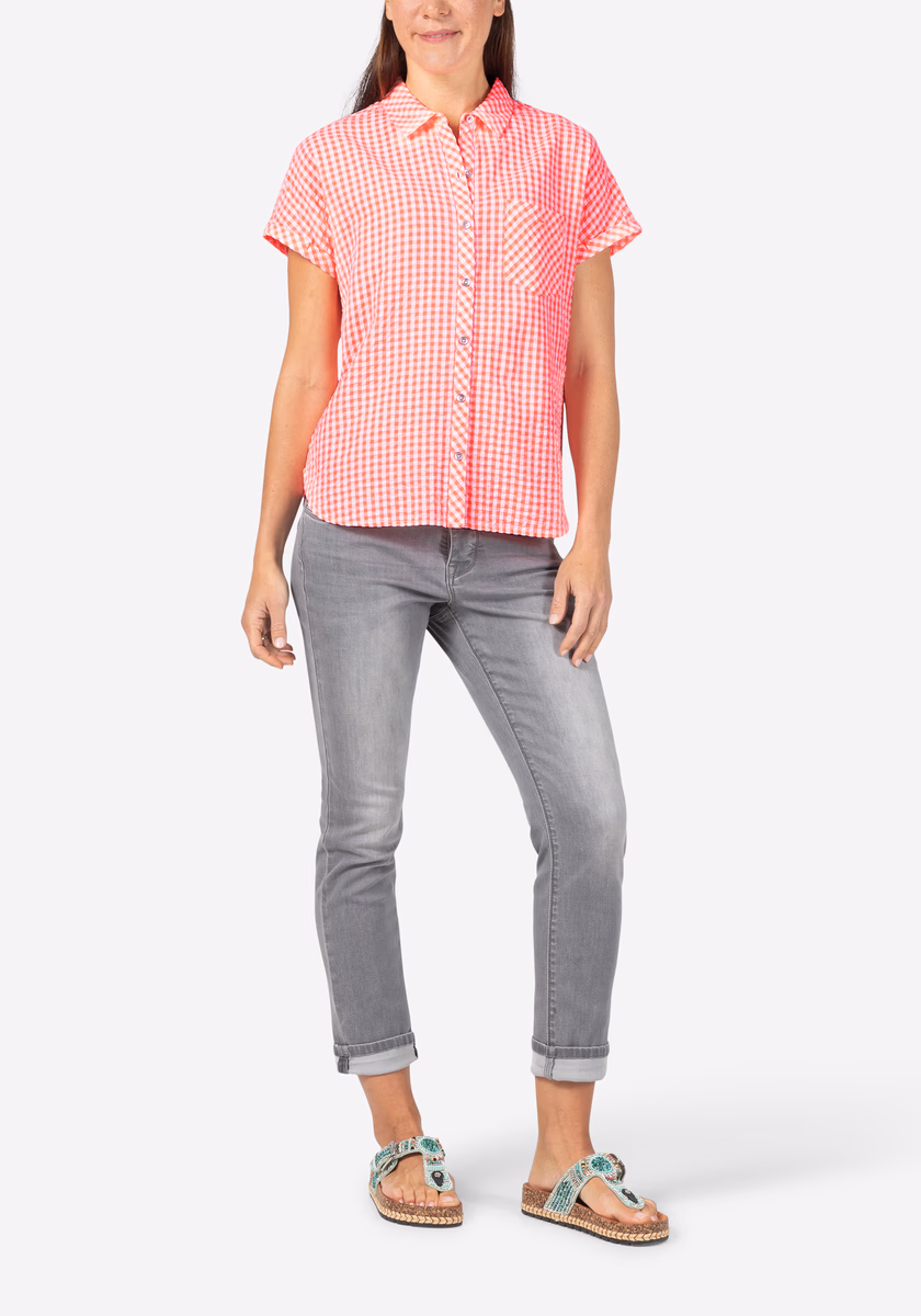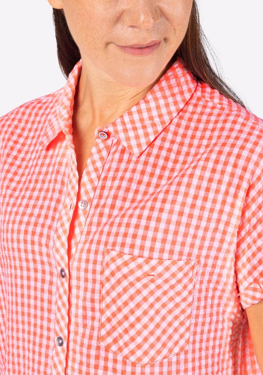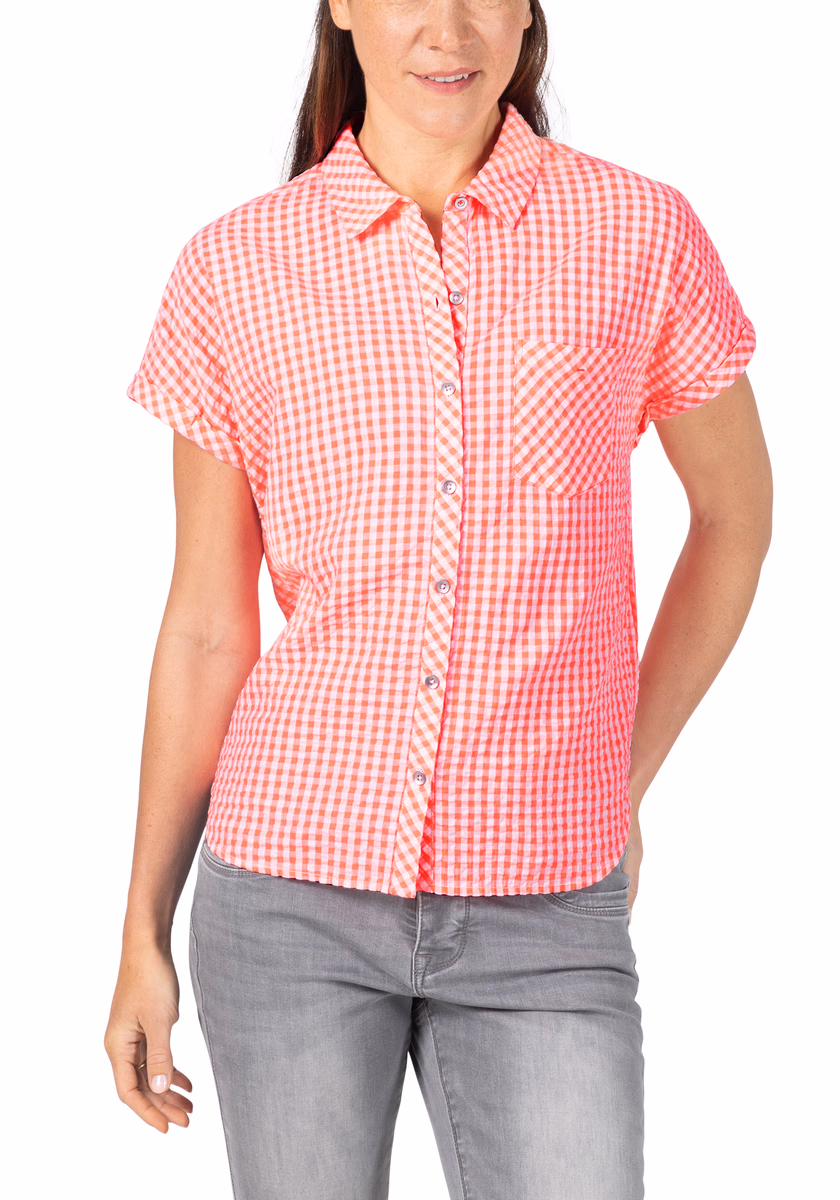 With fine neon details: Blouse Seersucker free cut with a casual checked pattern of Vichy made of high quality mixture of cotton and viscose. The blouse has a modern narrow collar Kent, strongly fallen shoulders with solid cuffs and a significantly rounded lower hem with amplification of the side seams. The blouse is fastened on small metal buttons and has a sewn pocket. Another styling tip: Wear it open in layering over a tank top.