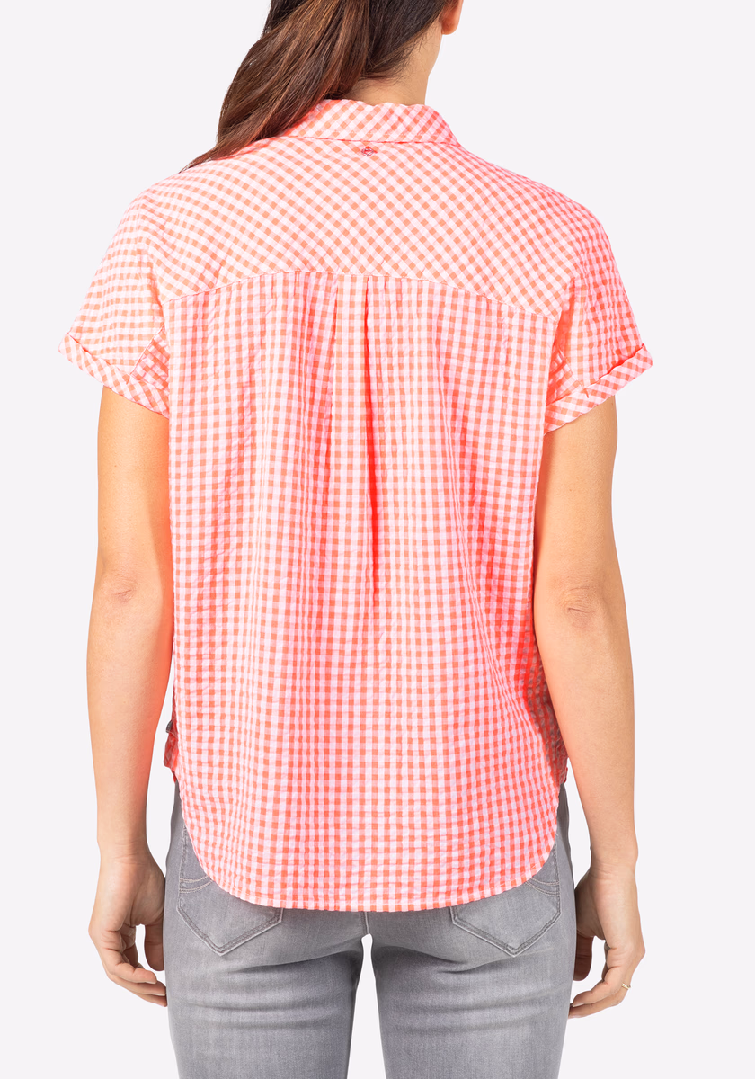 S jemnými neonovými detaily: blůza seersucker volného střihu s ležérním károvaným vzorem Vichy vyrobená z vysoce kvalitní směsi bavlny a viskózy. Halenka má moderní úzký límec Kent, silně spadlá ramena s pevnými manžetami a výrazně zaoblený spodní lem se zesílením bočních švů. Halenka se zapíná na malé kovové knoflíky a má našitou náprsní kapsu. Jiný stylingový tip: noste ho otevřený ve vrstvení přes tílko.