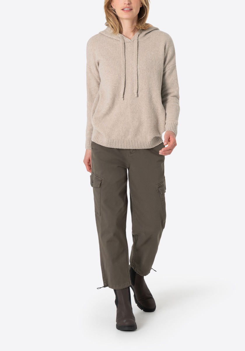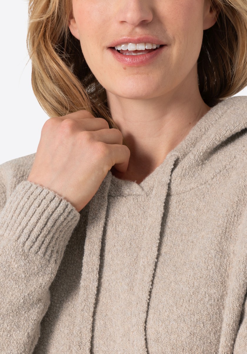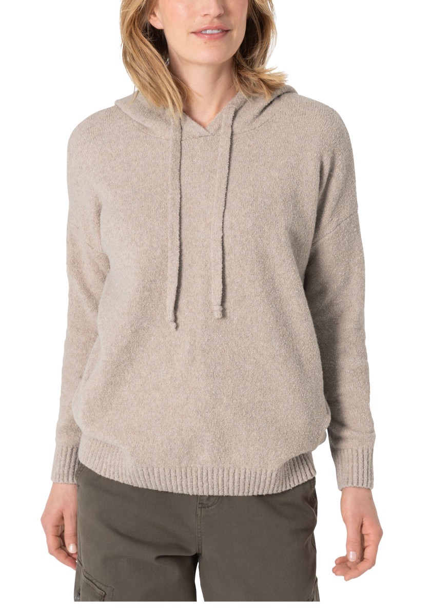 Perfektní alternativa ke klasické mikině: pohodlný pletený svetr se sportovními raglánovými rukávy. Nadýchaný model má klasický žebrovaný výstřih a úzké žebrované manžety a lem. Střih: volný, ženský. Kvalita: nadýchaná, kroucená boucle příze s obsahem elastanu vyrobená z měkké bavlněné směsi. Co je zvláštní: nápadný síťovaný vzor tvořený širokými příčnými žebry ve 3D vzhledu. Lze kombinovat se všemi našimi kalhotami.