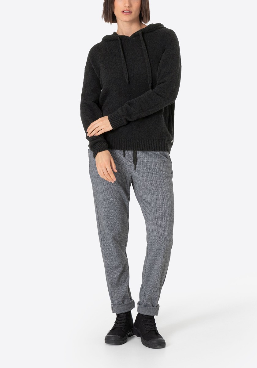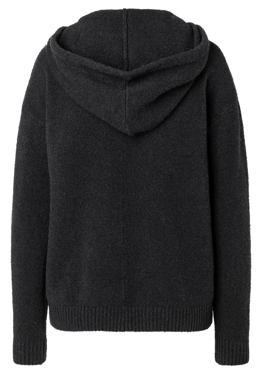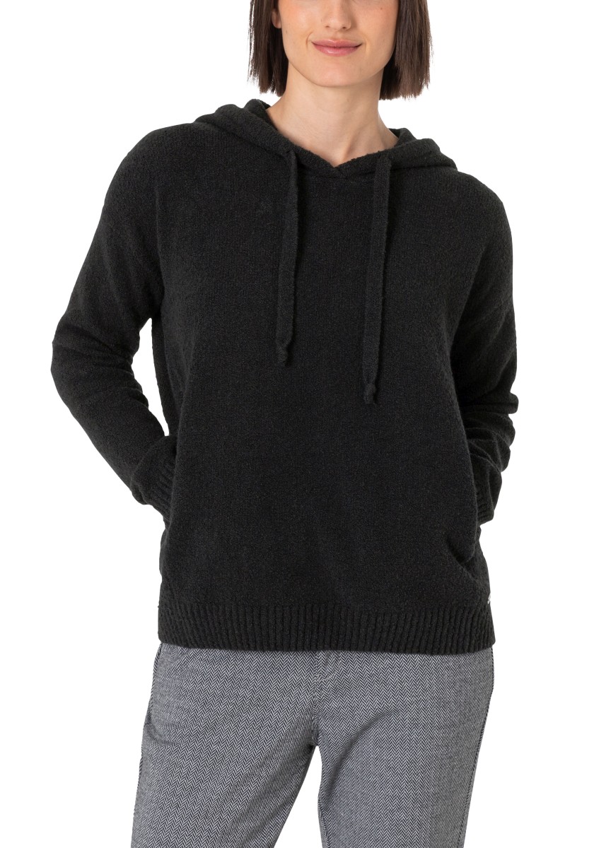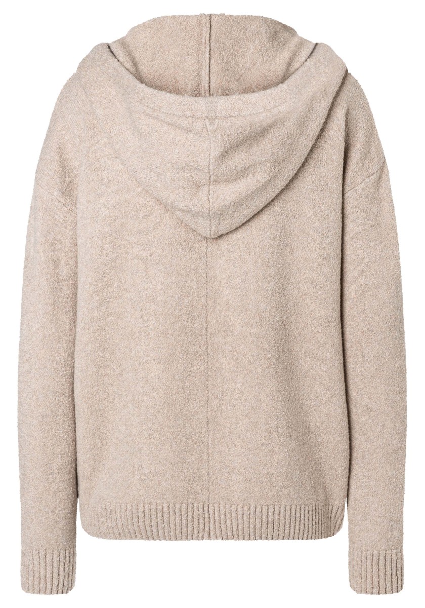 Perfektní alternativa ke klasické mikině: pohodlný pletený svetr se sportovními raglánovými rukávy. Nadýchaný model má klasický žebrovaný výstřih a úzké žebrované manžety a lem. Střih: volný, ženský. Kvalita: nadýchaná, kroucená boucle příze s obsahem elastanu vyrobená z měkké bavlněné směsi. Co je zvláštní: nápadný síťovaný vzor tvořený širokými příčnými žebry ve 3D vzhledu. Lze kombinovat se všemi našimi kalhotami.