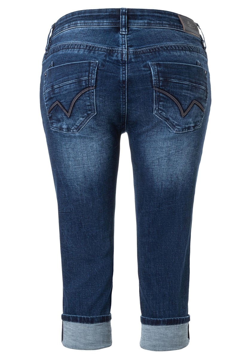 Capri džíny jsou dokonalou trendovou alternativou ke krátkým džínovým šortkám. Pro ty, kteří neradi ukazují nohy, je ideální delší verze. Dámský model úzkého střihu končí těsně pod koleny a vypadá obzvlášť ležérně, když je lem ohrnutý. Moderní styl s pěti kapsami v propracovaném střihu a s mnoha s láskou zpracovanými detaily. Kvalita: Světlá strečová džínovina, super měkká, pitoreskní, velmi pružná v ležérní, tmavě svěží modré barvě.