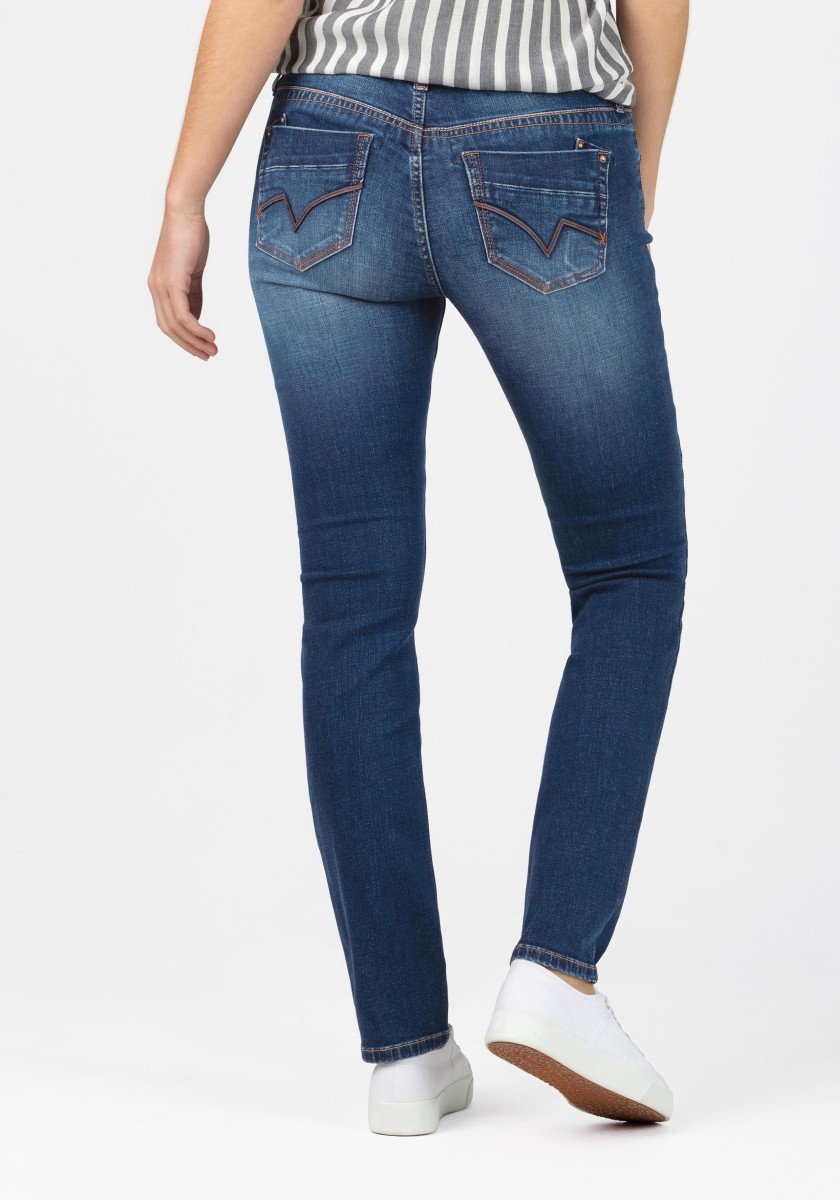 Young, modern jeans design in high quality denim in a robust cotton blend. Casual slim fit with straight legs, the modern variant of the cut ensures a perfect feminine silhouette, elastane stretches and plays an important role in a good fit. Large back pockets with appliqués make the bottom smaller and fuller. Detailed spread with genuine leather trim.