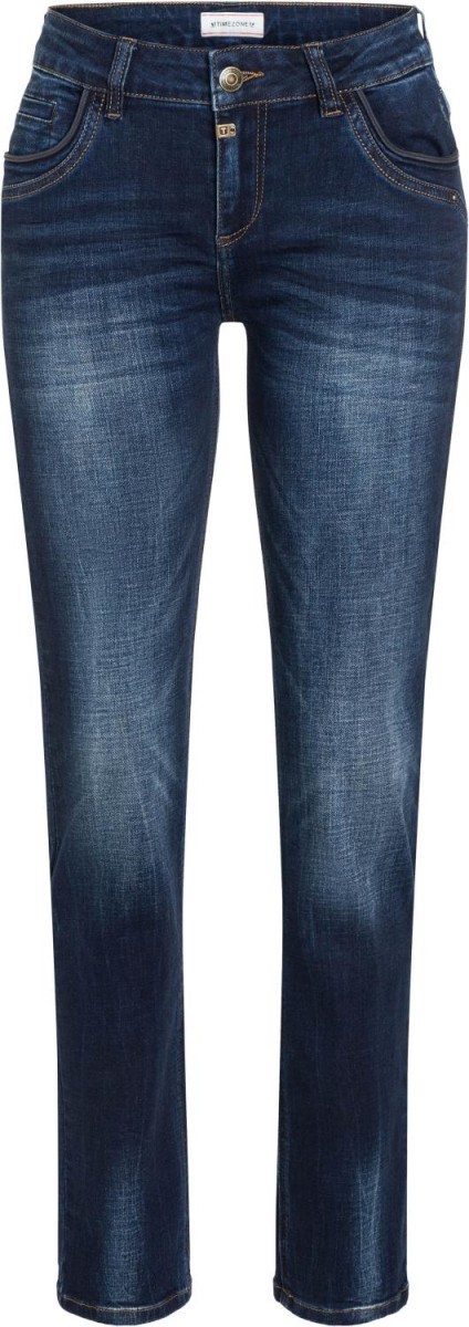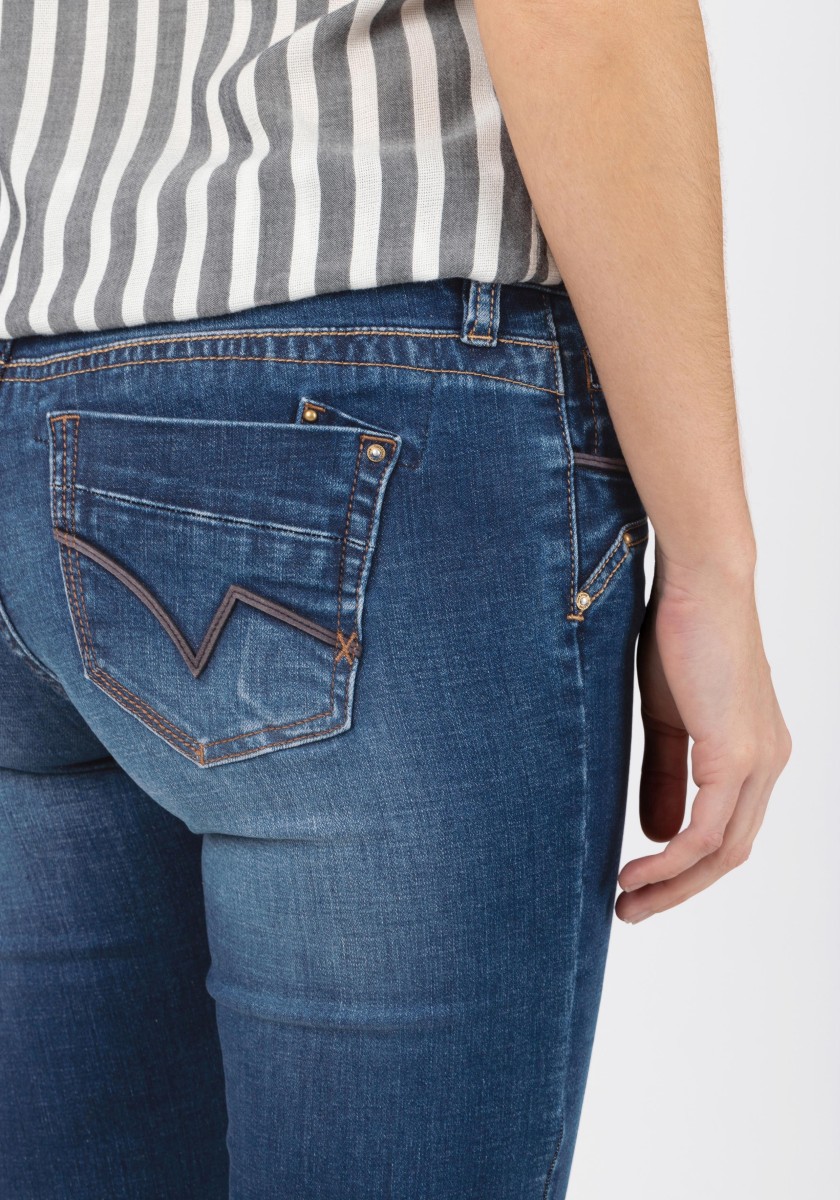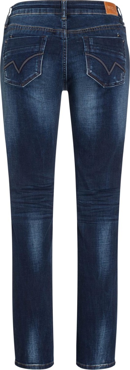 Mladý, moderní design džínů z vysoce kvalitní džínoviny v robustní bavlněné směsi. Ležérní úzký střih s rovnými nohavicemi, moderní varianta střihu zajišťuje dokonalou ženskou siluetu, elastan se natahuje a hraje významnou roli v dobrém padnutí. Velké zadní kapsy s nášivkami dělají spodní část menší a plnější. Detailní rozpětí s lemováním z pravé kůže.