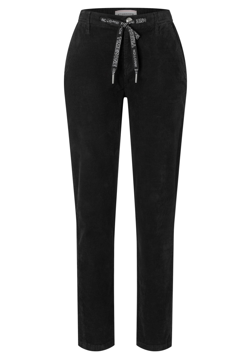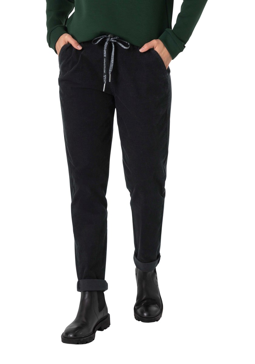 Nový model kalhot vzal naše srdce útokem: ležérní jemné manšestrové kalhoty s charakterem joggingových kalhot. Je vyrobena ze strečové směsi bavlny a má charakteristickou, vroubkovanou, sametovou povrchovou strukturu. Regular fit s normální výškou pasu a zkrácenými nohavicemi. Kalhoty mají pružný pas se stahovací šňůrkou a poutavou šňůrku s třpytivým logem. Šikmé přední kapsy a falešné prošívané kapsy na zádech. Zapínání: klasický zip.