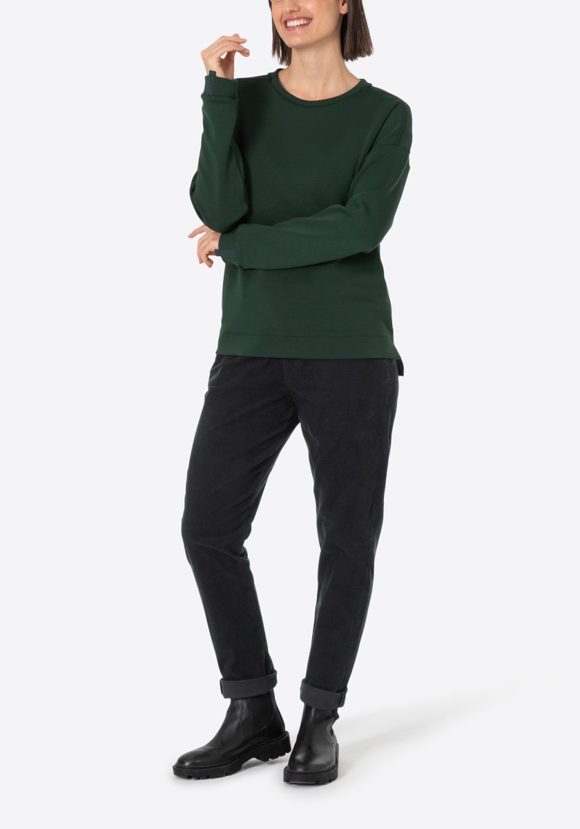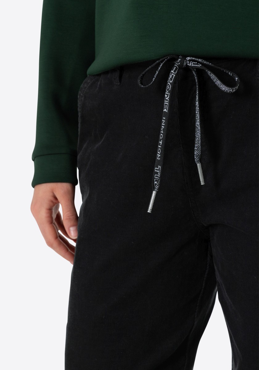 The new model of pants took our hearts by attack: casual fine corduro pants with the character of jogging pants. It is made of a stretch mixture of cotton and has a characteristic, knurled, velvety surface structure. Regular fit with normal waist height and shortened legs. The pants have a flexible waist with a drawstring and an engaging cord with a glittering logo. Oblique front pockets and fake quilted pockets on the back. Fastening: Classic zipper.