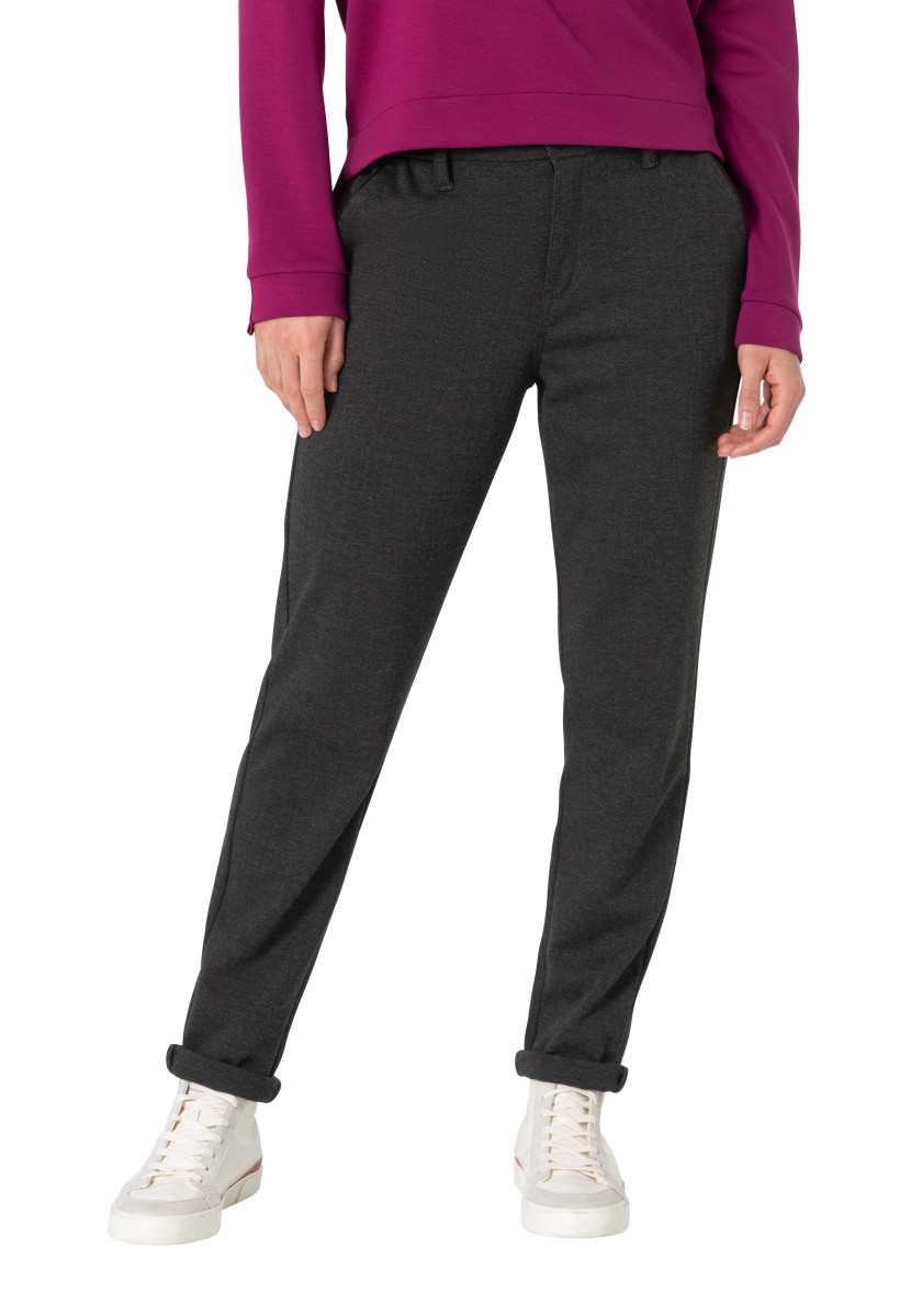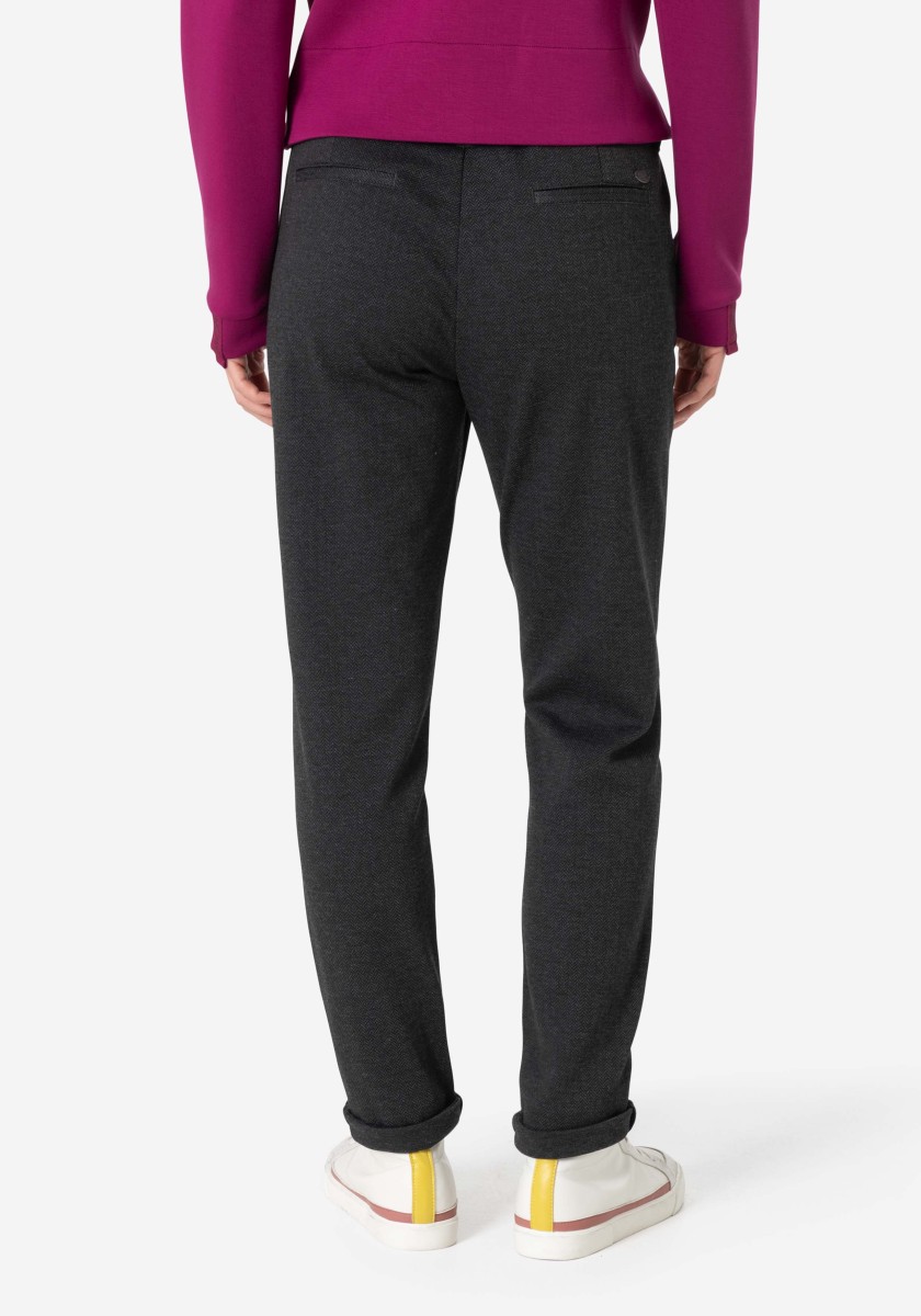 The new pants model took our hearts by attacking: casual jersey pants with the character of jogging pants and an elegant look. It is made of stretch polyester mix with wool appearance and has a timeless classic pattern of fish bone. Comfortable regular cut with normal waist height and shortened legs. The pants have an elastic waist with a drawstring and a string area with a logo. Oblique front pockets and fake quilted pockets on the back. Fastening: Classic zipper.