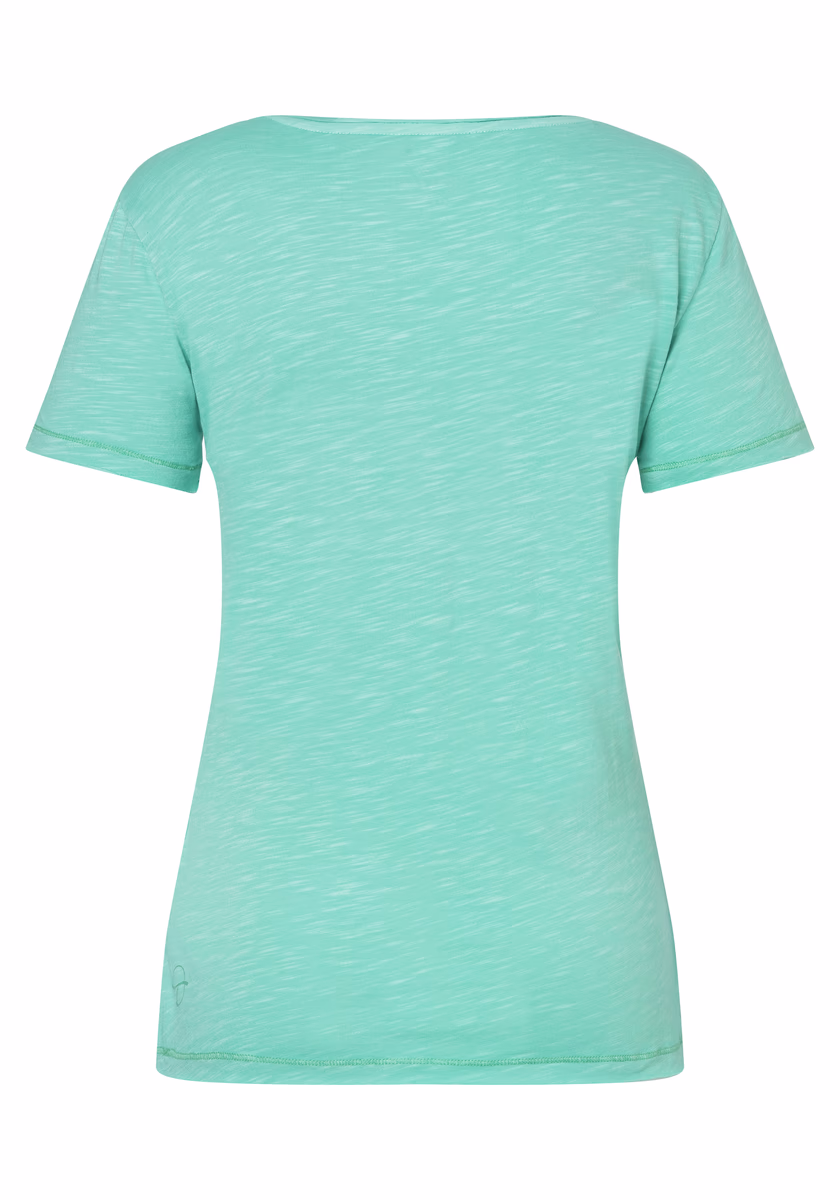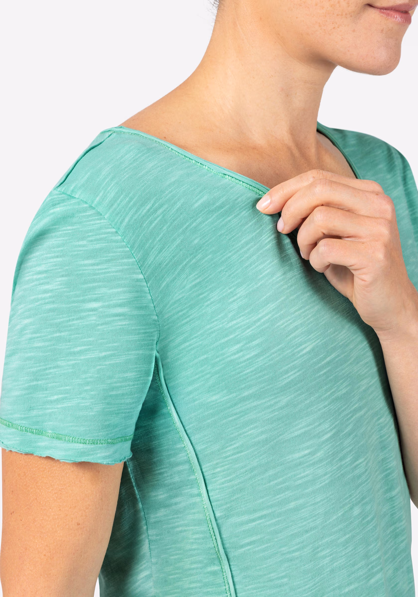 Modern, casual Basic T -shirt with round neckline, short sleeves and distinctive seams in a comfortable female cut. The shirt is made of very light sliding jersey made of mixture of cotton and viscose. All edges and seams are either open, child flat, or naturally cut and rolled up. The model offers many styling options and a wide range of colors. It can be worn throughout the year and adapts to every change in the season.