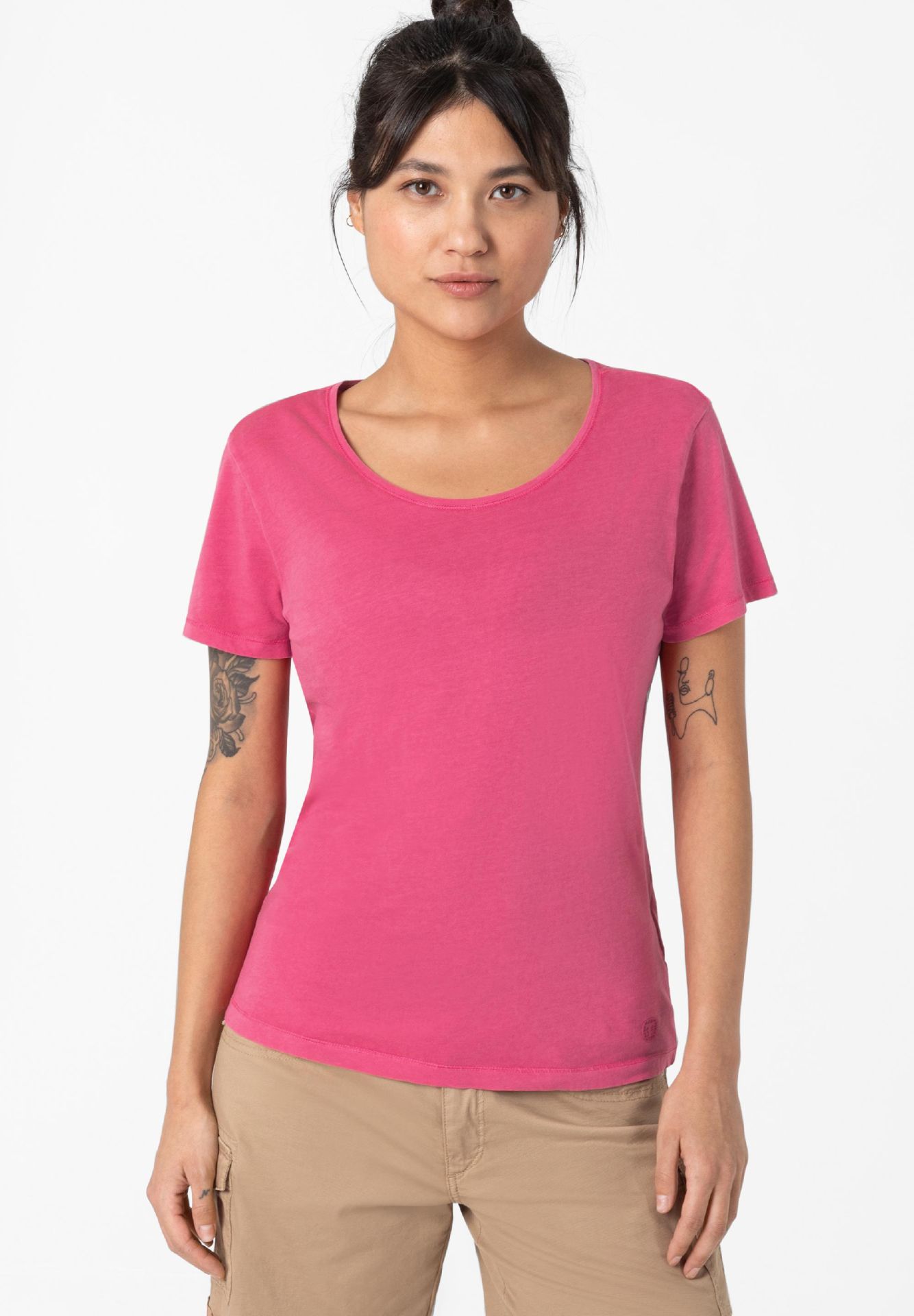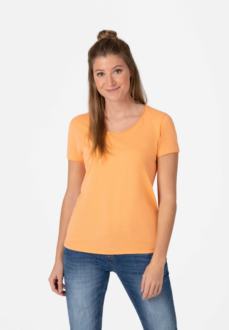 Are the basis for every fashionable outfit, belong to the ten most important wardrobe staples in the closet and are absolute talent for combinations: plain-colored T-shirts. This model made of soft, pure cotton single jersey has a loose, straight fit and a hem with a cool baseball seam. Round neckline and sleeve hem have casual, cut rolled edges. A great basic piece and a high-quality fashion companion for many different occasions.
