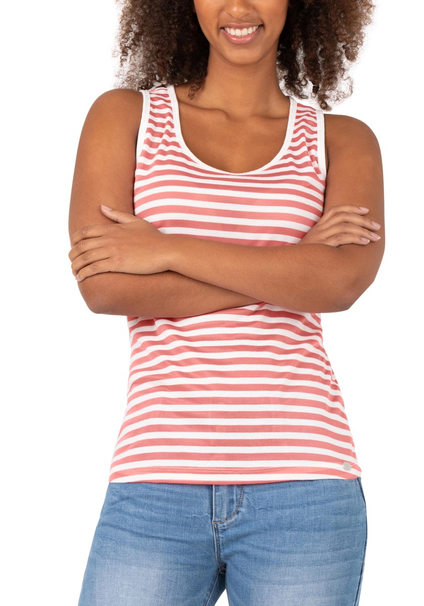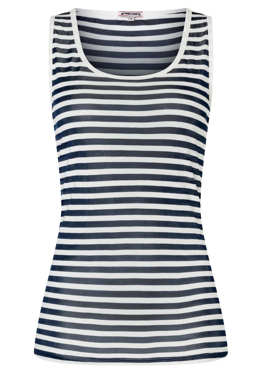 It combines four important fashion trends in one piece: sleeveless, stripes, transparency and the French girl look. The super casual tank top in a quality cotton/polyester blend is our new favourite t-shirt alternative. Styling tip: visible bra straps are a detriment, opt for bandeau cuts instead. The tank top has a deep round neckline and a cool bell neckline at the back. All the edges are edged with soft, simple stitching.