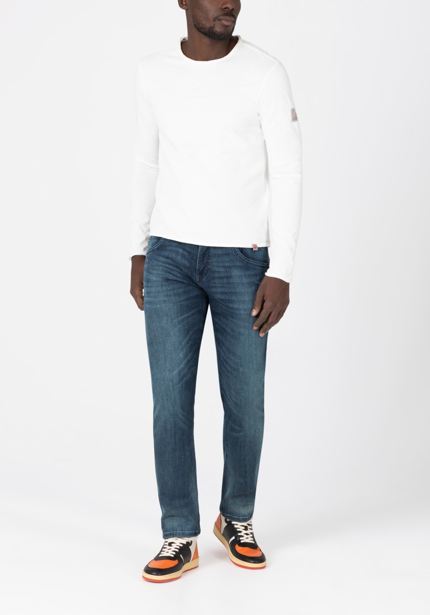 Made of super soft, super stretch and super comfortable Navy Flex denim: informal jeans of conventional cut. They are surprisingly versatile and offer a slim leg, a modern and timeless style with five pockets, a normal rise and a super casual look. Quality: Exclusive mixture of cotton-polyester-elastan. Washing: Smoke Blue Wash with lighter track of abrasion and incorporated folds of seats. With elegant, colorful seams and genuine leather label.