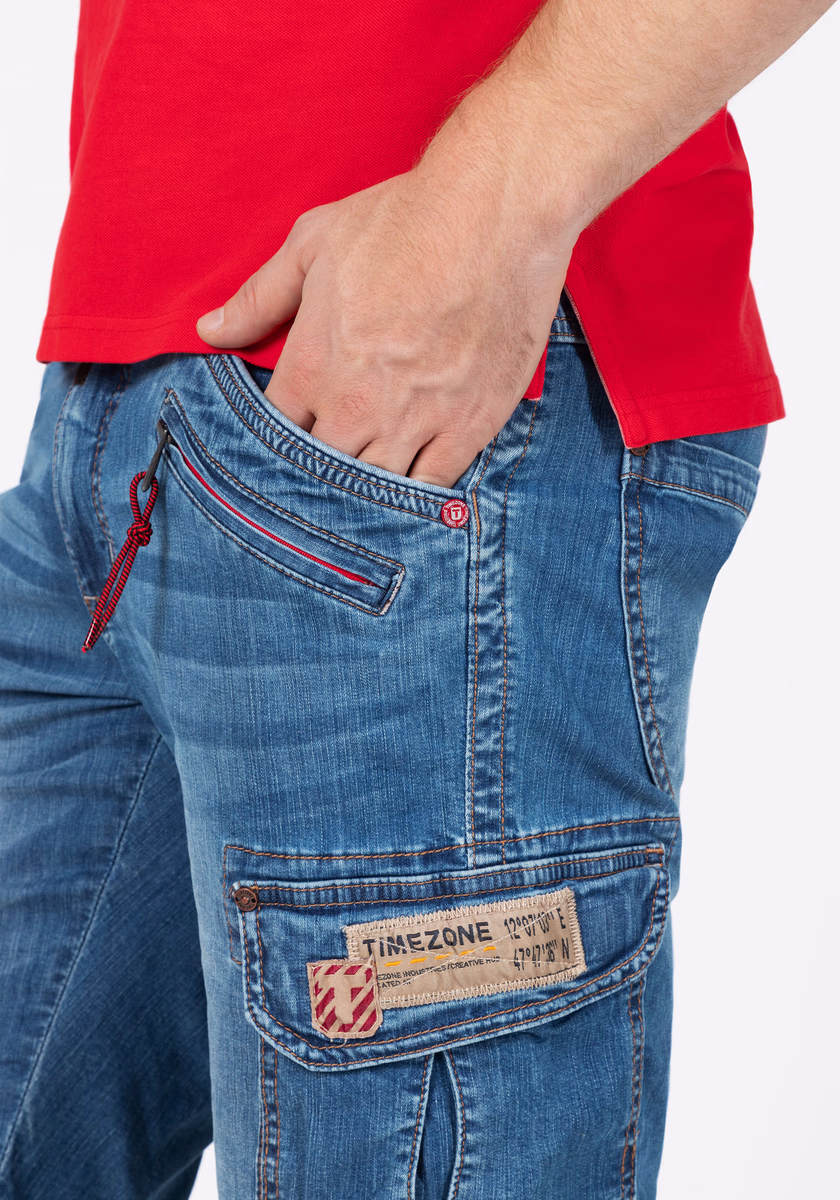 These casual cargo jeans shorts are made of durable and light indigo denim and have a regular cut with medium stature and slim short leg. Pants have engaging finishing details, distinctive quilted seams and numerous pockets for everyday necessity. It is worth mentioning: sophisticated patches with logo, real leather details and other zippered pocket. Wasted look with fine traces of abrasion and permanent folds of sitting.