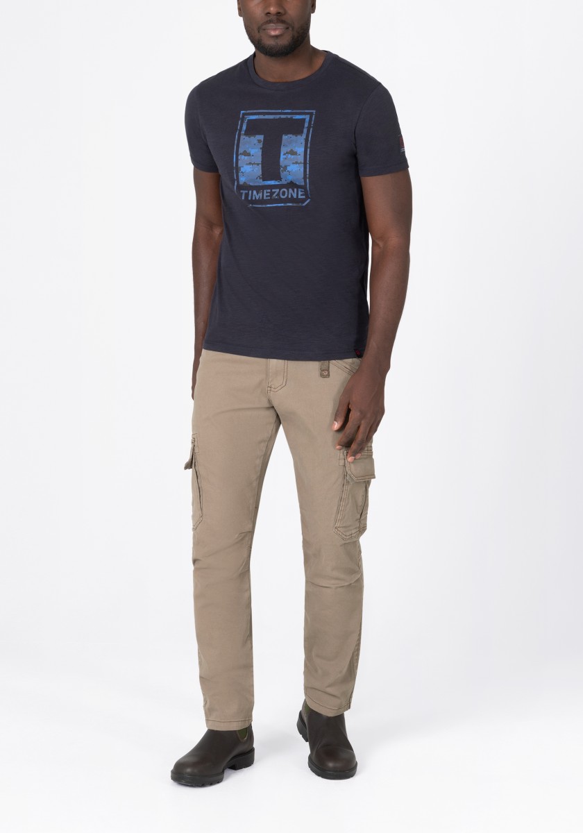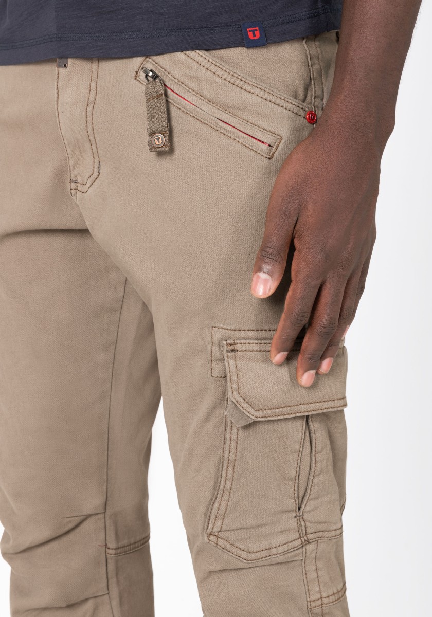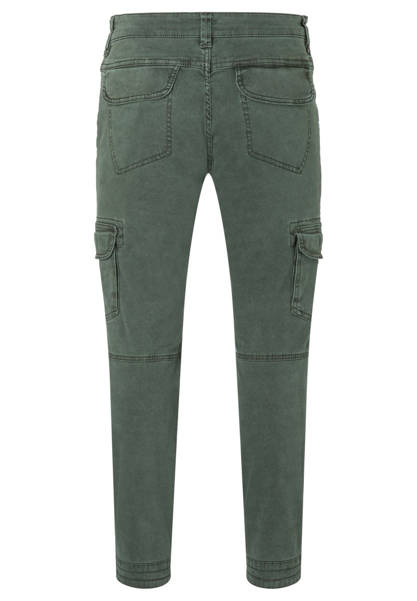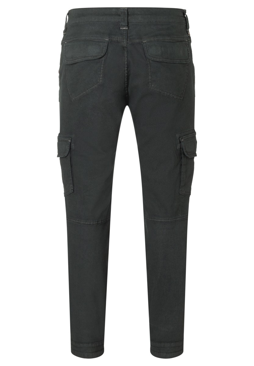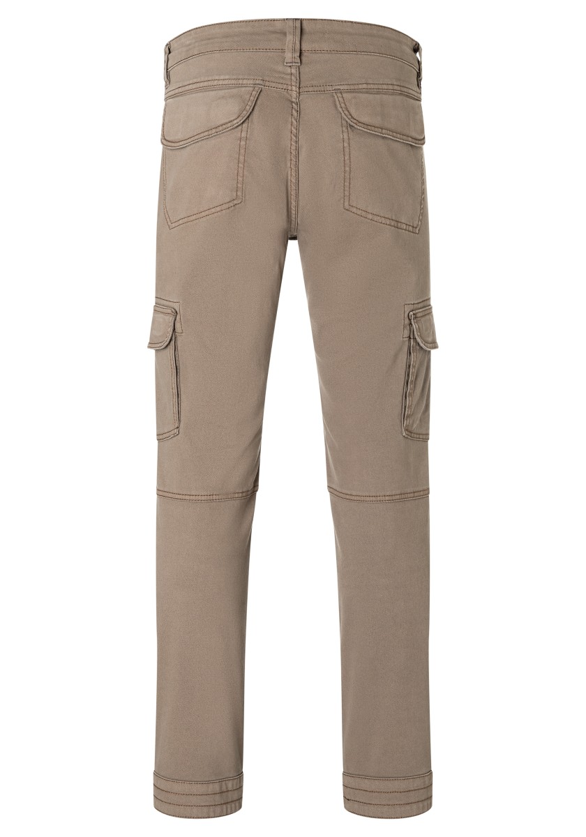 Inspired by workwear and redesigned for everyday use: cargo pants. This model is made from a stretchy, robust and peached Dobby quality in a washed cotton mix. With tough workmanship details, striking stitching and a sophisticated, slightly pre-shaped knee section. Practical and characteristic: Two slanted side pockets with a coin pocket, a zipper pocket, two cargo flap pockets on the sides and two quilted flap pockets on the back.