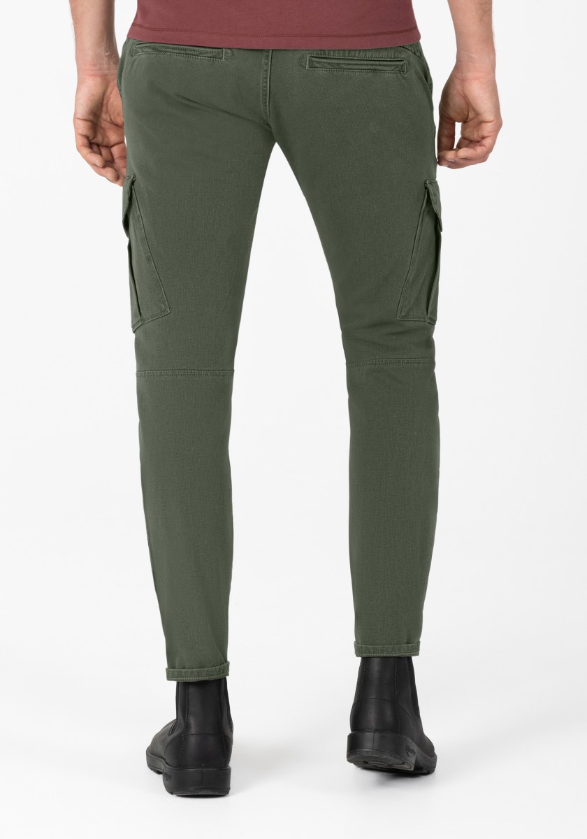 Od 90. let jsou na začátku každé sezóny: cargo kalhoty. Nyní s modernějším designem a nově vyvinutými, ještě pohodlnějšími látkami. Tento model je vyroben z elastického, vysoce kvalitního a robustního bi-stretch dobby kvality ve směsi bavlny a má pravidelný střih se středním pasem a štíhlými nohavicemi. Funkční a ležérní, cargo kalhoty lze obzvláště dobře kombinovat se sportovními komponenty, jako jsou tenisky. Charakteristika: kapsy na bocích.