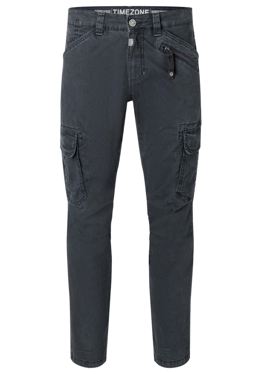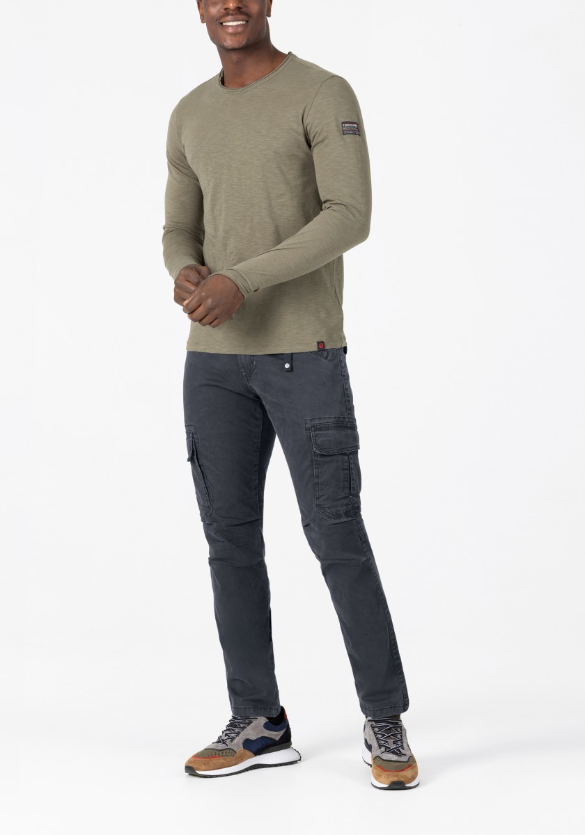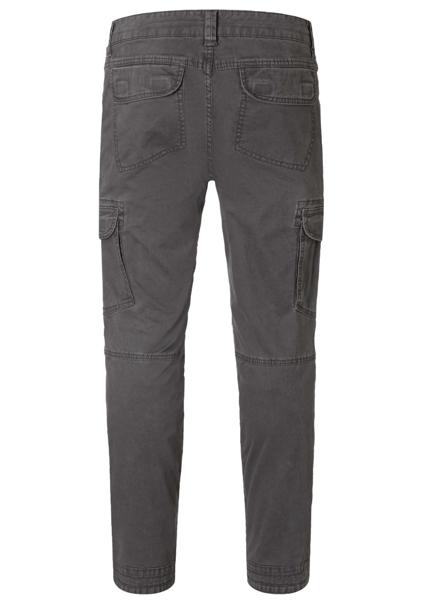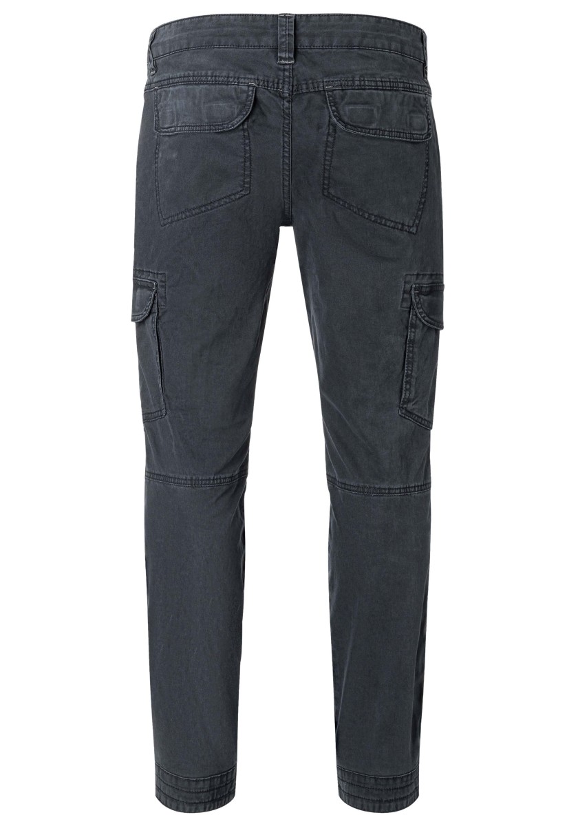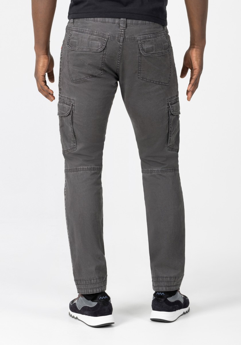 Cargo trousers inspired by workwear and redesigned for everyday wear. This model is made from stretchy, strong and smooth twill in a washed cotton blend. With thoughtful workmanship details, distinctive stitching and a worked, slightly pre-shaped knee. Practical and characteristic features: two slanted pockets with coin pocket, one zipped pocket, two cargo pockets with flap on the sides and two flap pockets on the back.