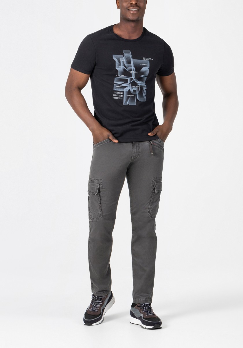 Kalhoty cargo inspirované pracovními oděvy a přepracované pro každodenní nošení. Tento model je vyroben z pružného, pevného a hladkého kepru ve směsi prané bavlny. S promyšlenými detaily zpracování, výrazným prošíváním a vypracovanou, mírně předtvarovanou kolenní částí. Praktické a charakteristické prvky: dvě šikmé kapsy s kapsičkou na mince, jedna kapsa na zip, dvě nákladové kapsy s klopou na bocích a dvě kapsy s klopou na zadní straně.