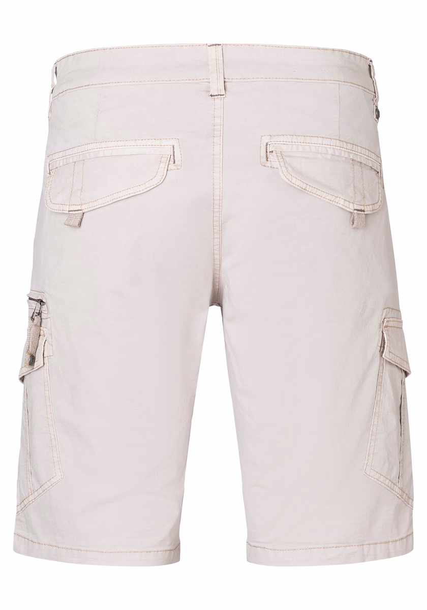 Lehký kepr se setkává s ripstopem! Ležérní cargo šortky s mužnými detaily jsou vyrobeny z robustní směsi materiálů z pružné bavlny. Model s klasickým pasem, boční kapsou na mince, kulatými kapsami s lemovaným okrajem vpředu a další jednostrannou kapsou na zip. Boční kapsy s patkou a dvě zadní kapsy s patkou se zapínají na patentky. Exkluzivní proces barvení a praní oděvů zajišťuje vintage chlad.