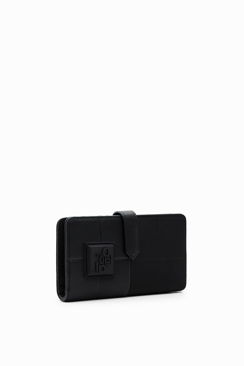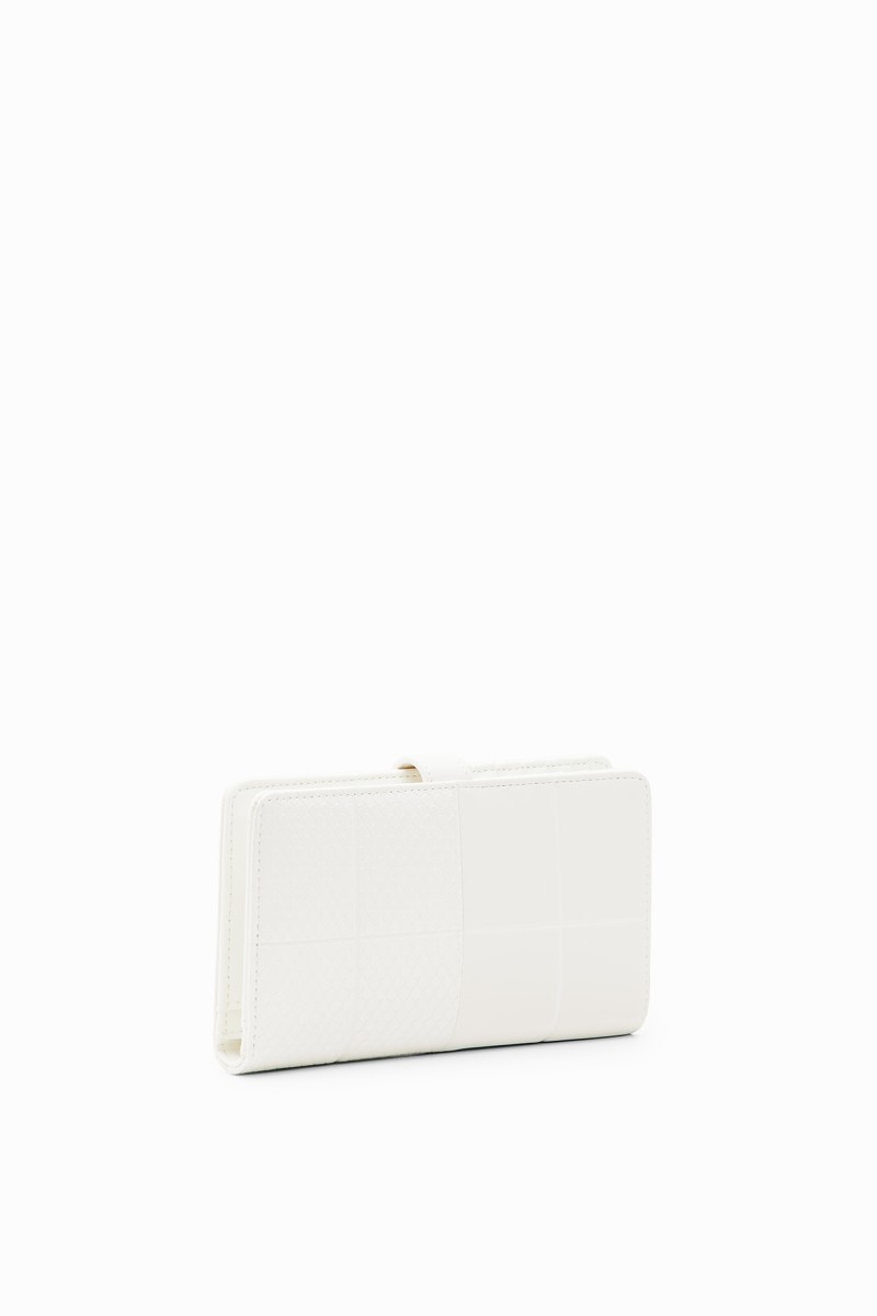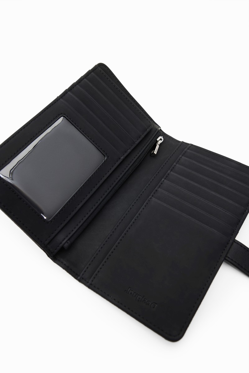 Peněženka střední velikosti s patchworkem z různých materiálů, vyraženým logem a několika přihrádkami.