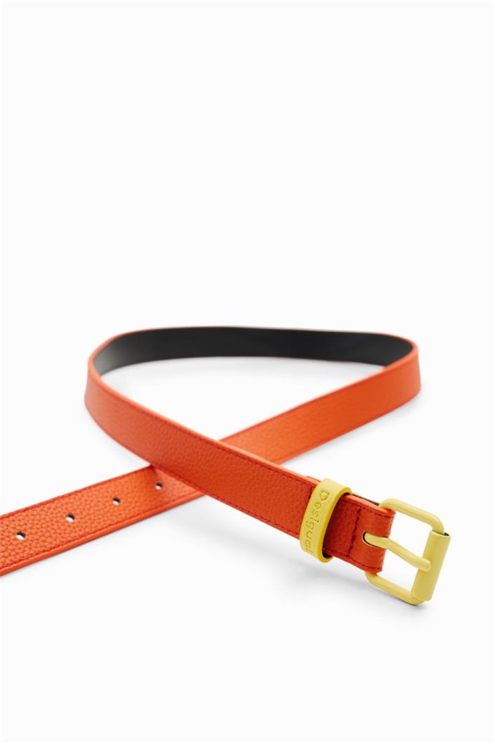 Smooth leather effect belt with texture and contrasting metal buckle.