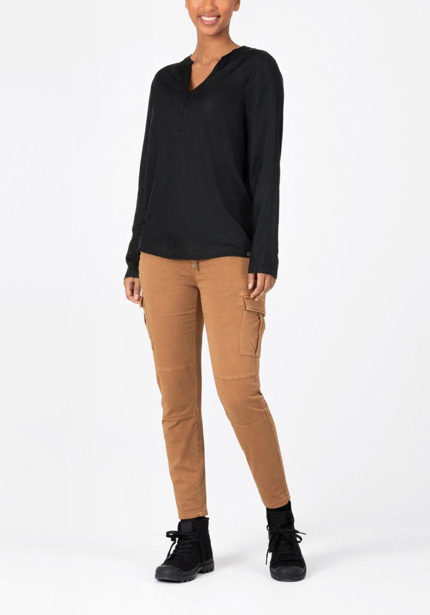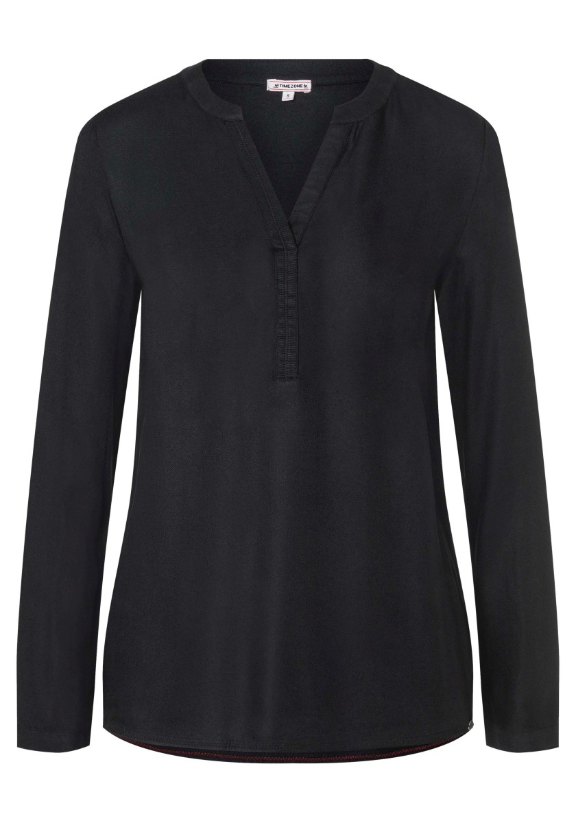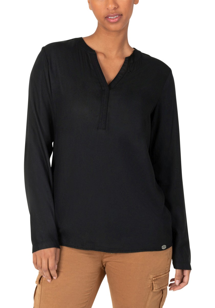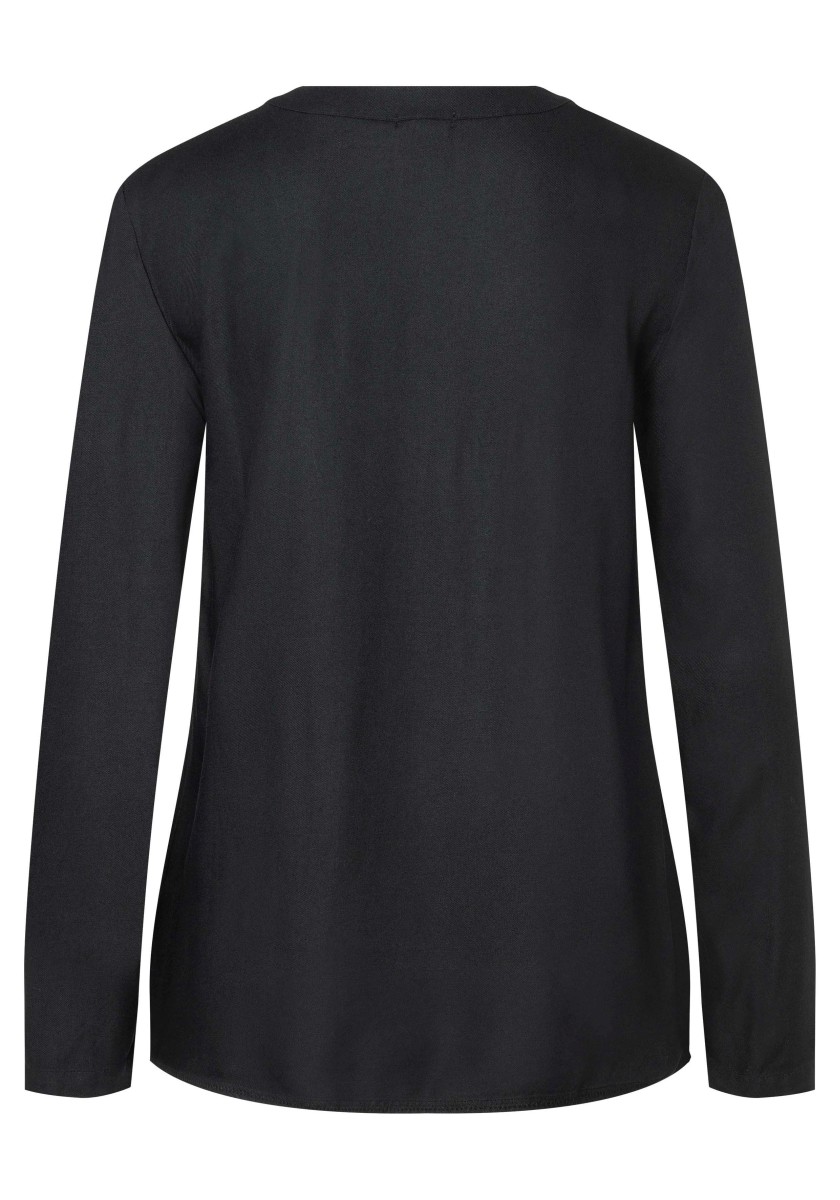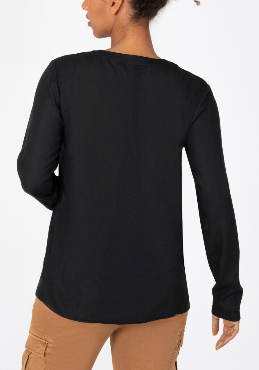 A blouse that doesn't need to hide under a jacket or blazer, but stands confidently on its own: a sporty slip-on model in flowing, soft viscose twill. The long-sleeved blouse has a henley-style V-neck stand-up collar with attached ribbed tape, regular cuffs and a rounded hem with contrast zig-zag stitching on the inside.