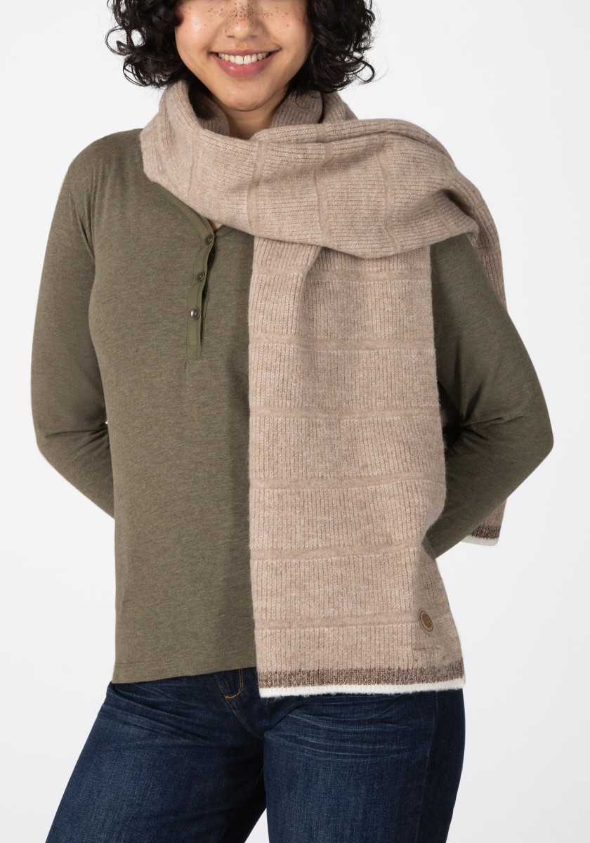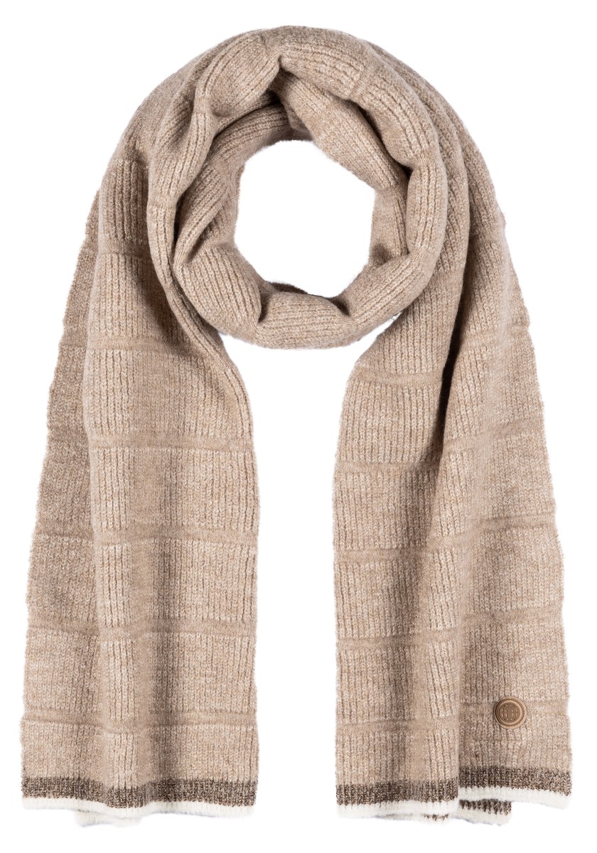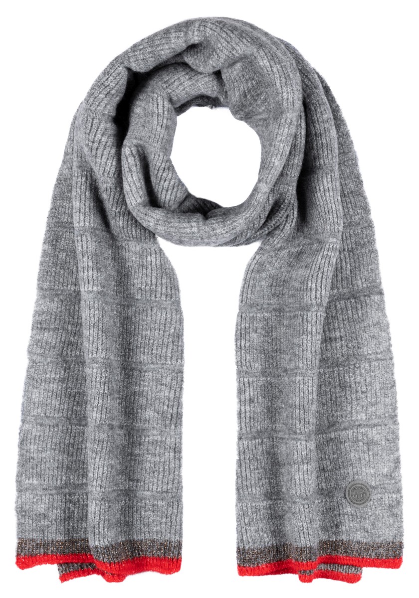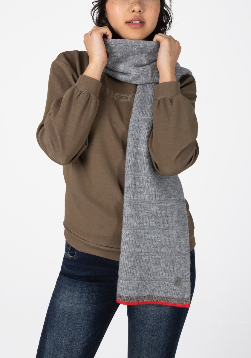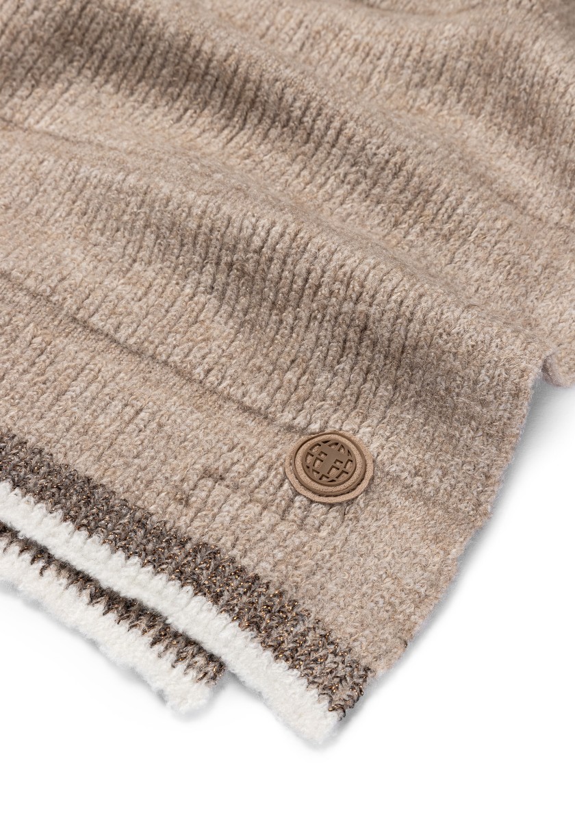 They are stylish and warm, spice up any outfit and always make a cool statement: knitted scarves. This modernly designed model is made from a cozy, super soft yarn mix with a tonal, structured striped pattern and has a perfect styling format. Ideal for placing the casual piece over your shoulders, draping it, knotting it or simply wrapping it loosely around your neck. At the ends: narrow contrasting stripes with glittering lamé yarn.