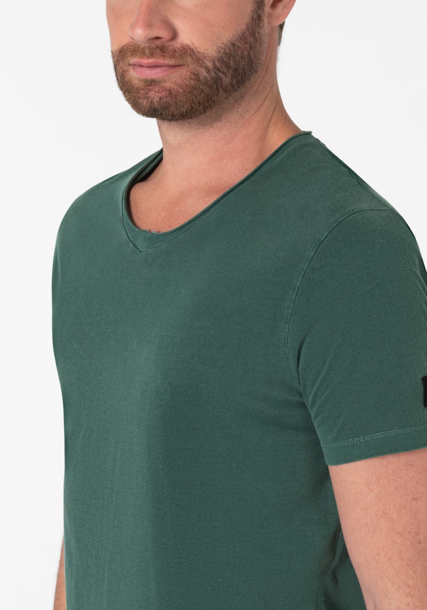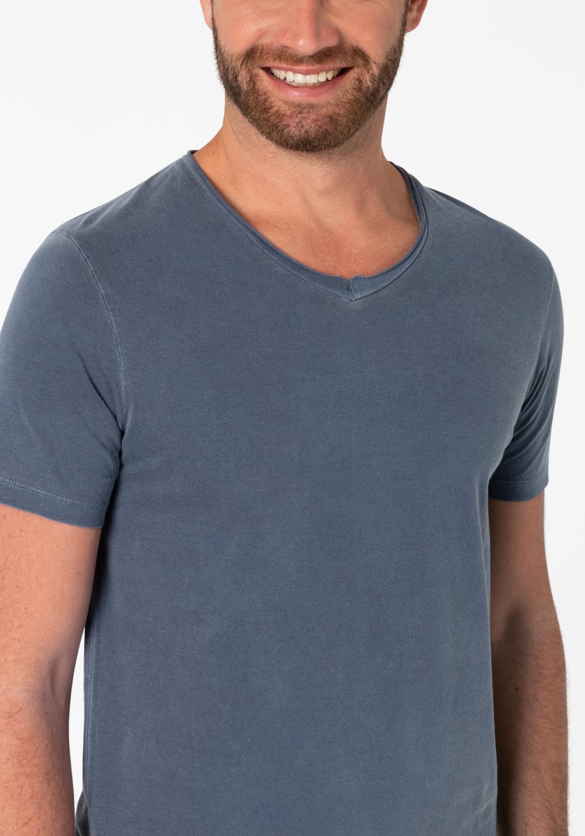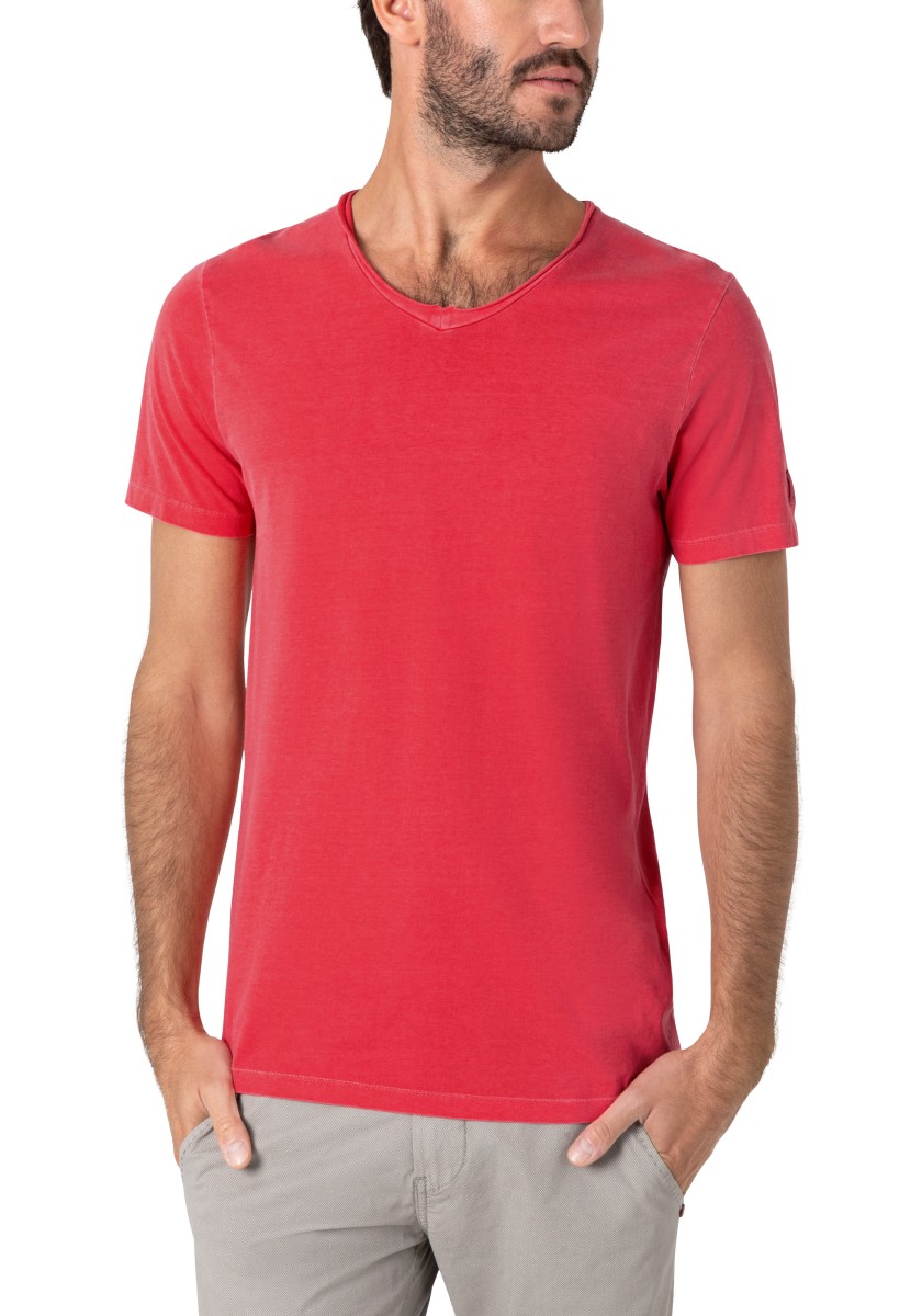 Clean, simple design T -shirts with casual cut and rolled up V -neck. The end of the sleeves and hem are classically ending with a double seam. Quality: Soft single jersey fabric made of pure, high quality cotton. What is strange: deliberate color irregularities are caused by the process of dyeing clothes. Comfortable: Soft print on the neck instead of annoying woven label. Available in many summer colors.