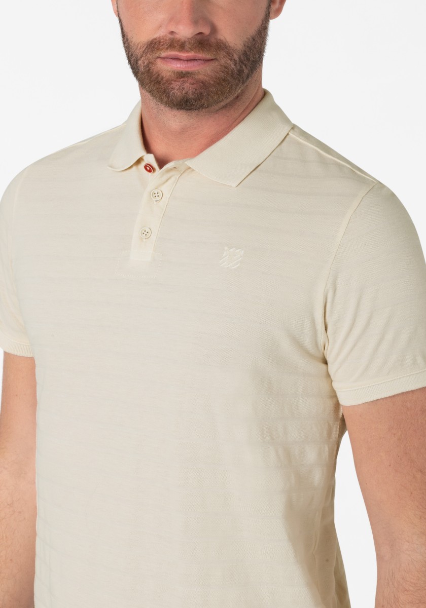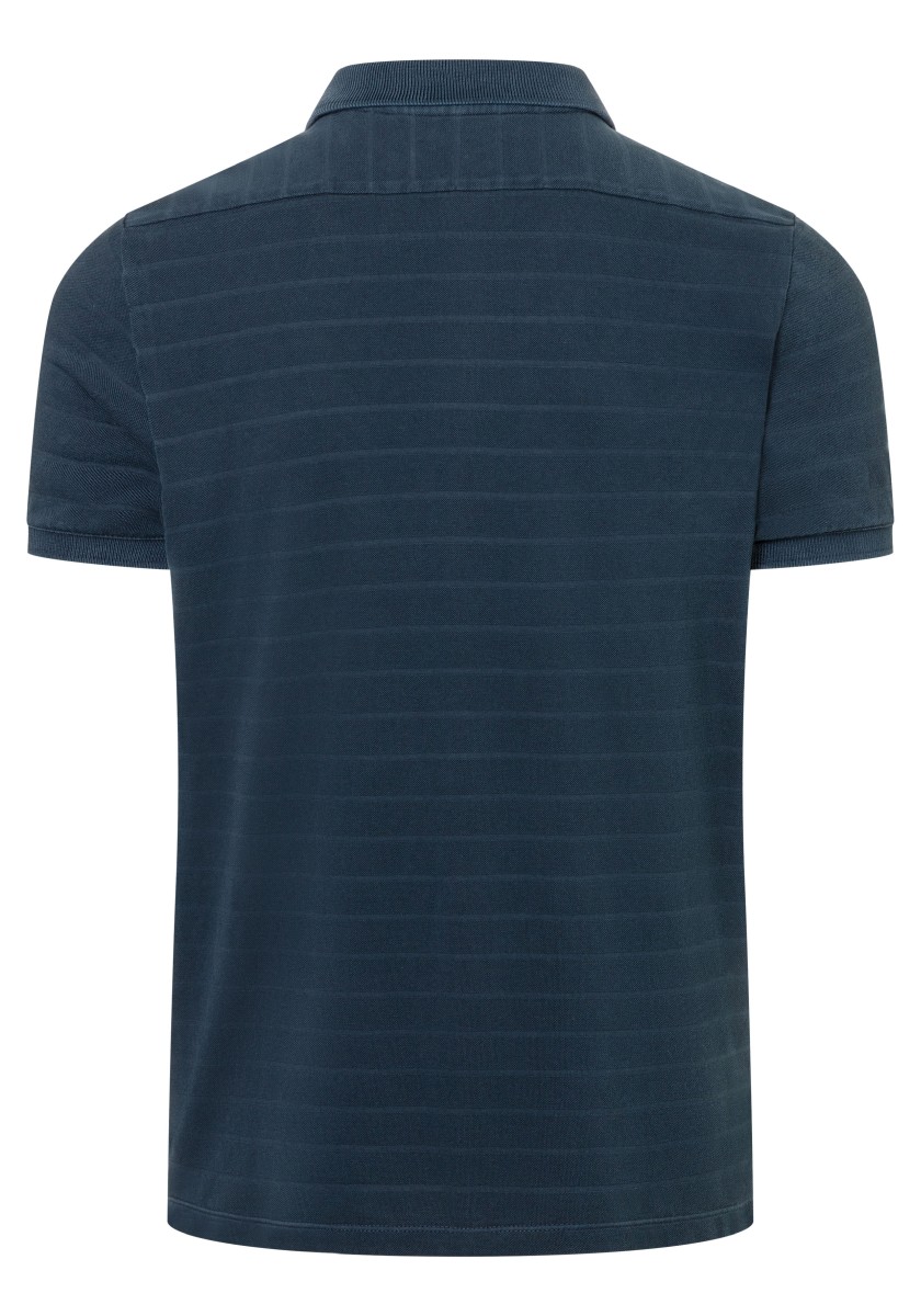 Polokošile s krátkým rukávem je kombinací polokošile a trička a je dodávána s charakteristickým plochým límcem. Pozornost je zde jednoznačně zaměřena na materiál. Zajímavý žakárový piqué žerzej má propracovaný, tónovaný pruhovaný vzor a ležérní barevné praní s efektem barviva na oděvy. Model s krátkou úzkou knoflíkovou légou, odpovídající výšivkou loga na hrudi, úzkým ramenním sedlem a ležérně rozparkovanými bočními švy.