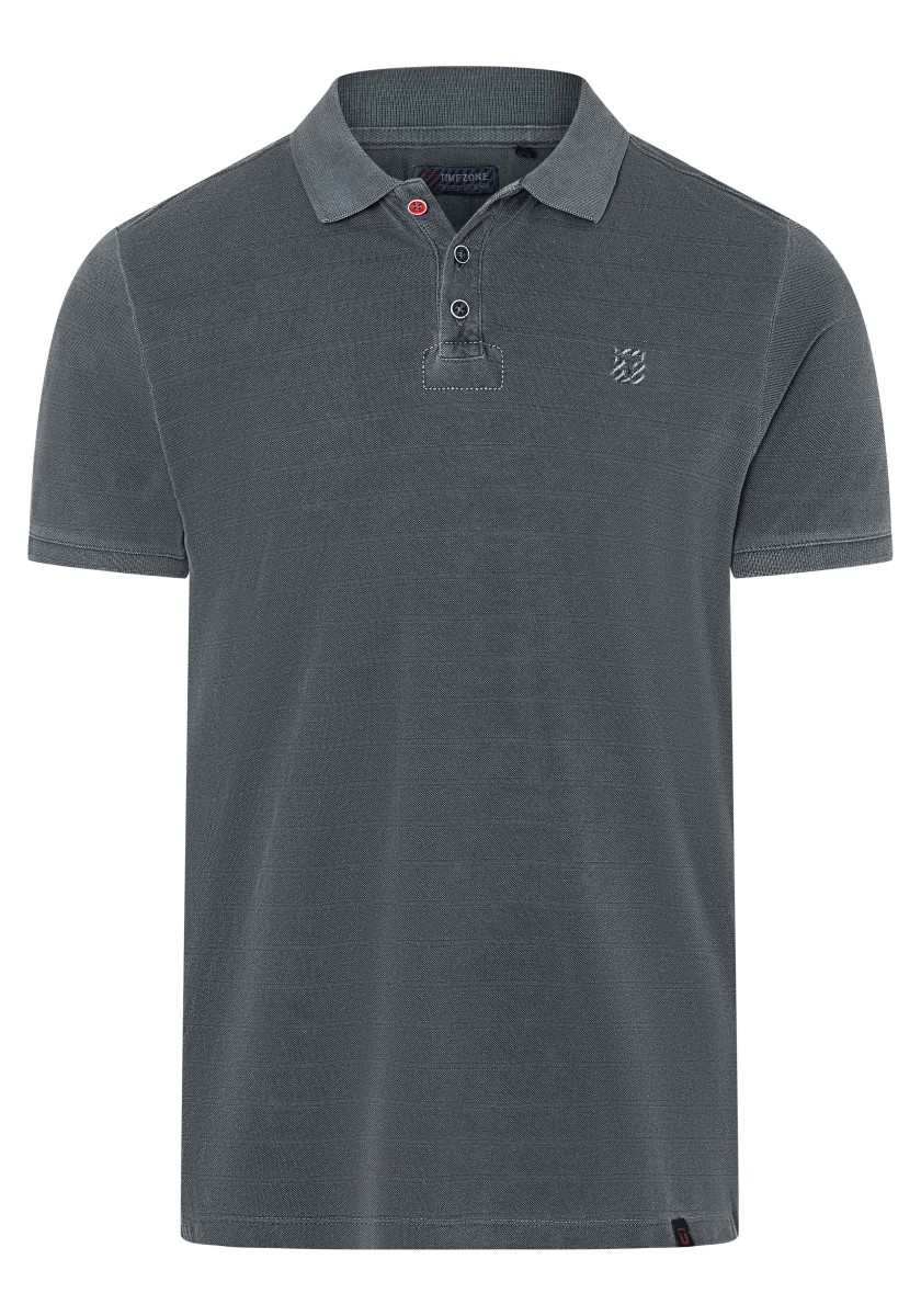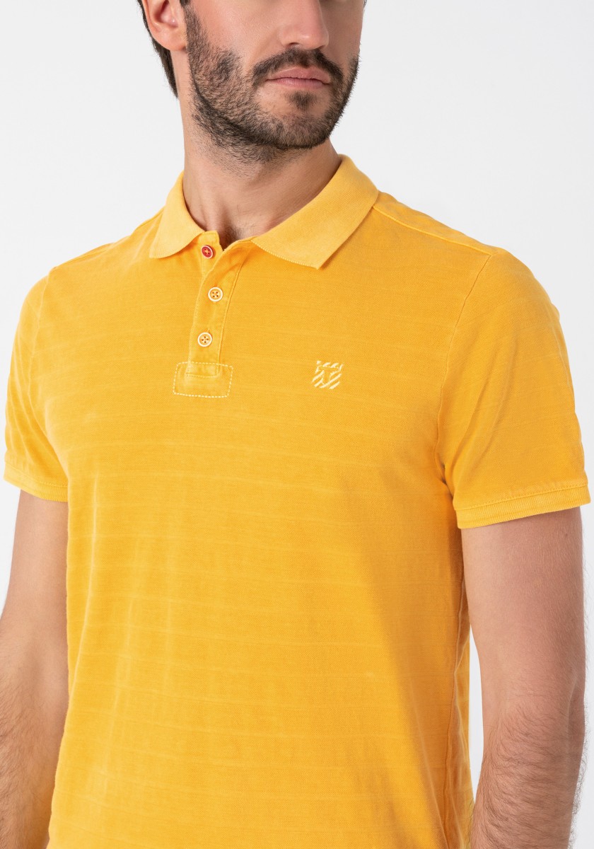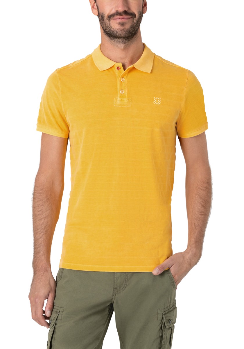 Short -sleeved polo shirts are a combination of polo shirts and t -shirts and comes with a characteristic flat collar. Attention is clearly focused on the material. An interesting jacquard piqué jersej has a sophisticated, tinted striped pattern and casual color washing with the effect of dye on clothing. A model with a short narrow button fly, corresponding to the embroidery logo on the chest, a narrow shoulder saddle and casually parked side seams.