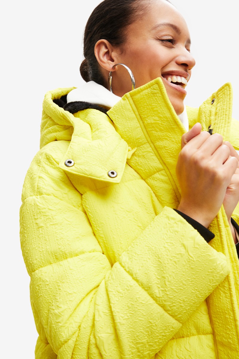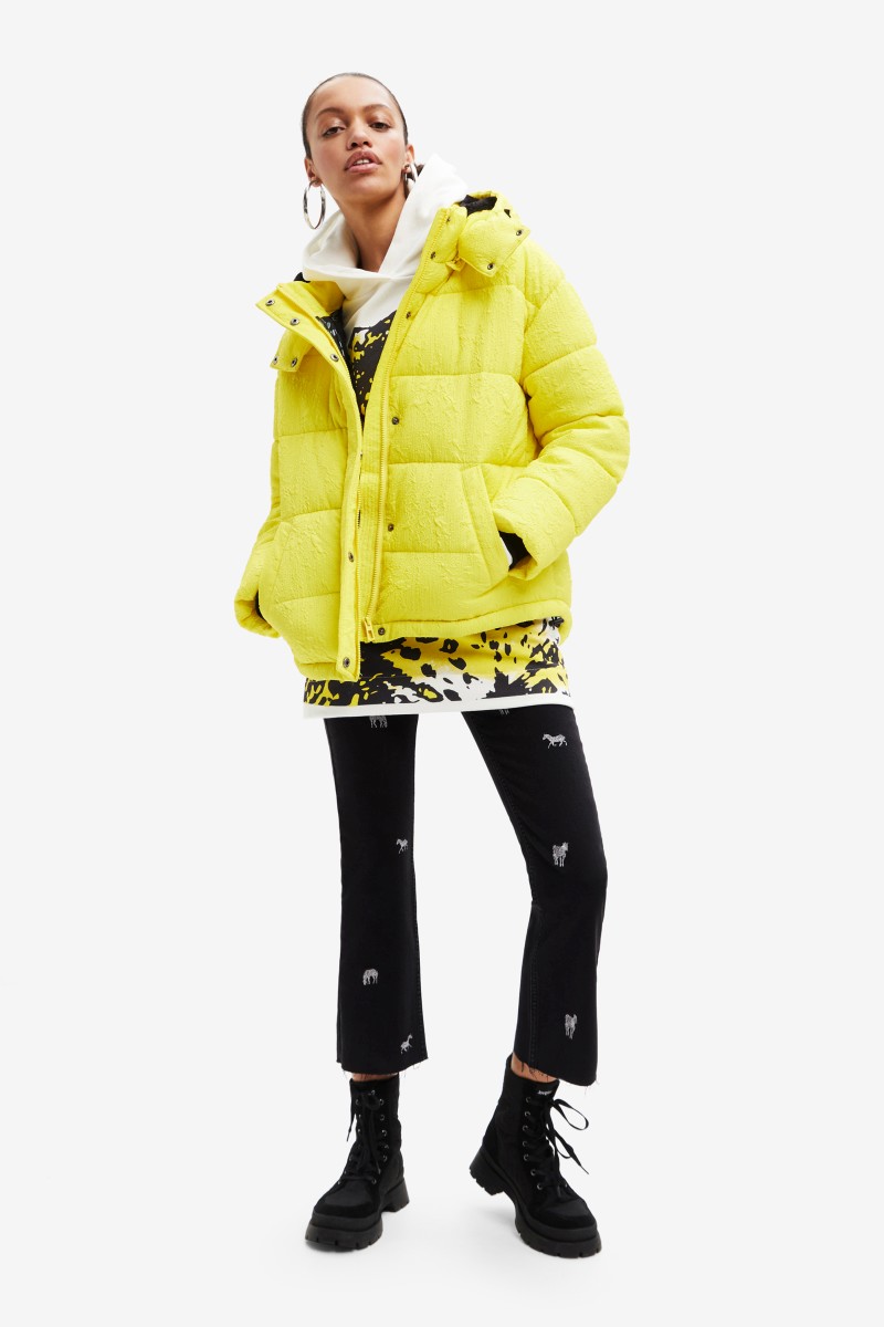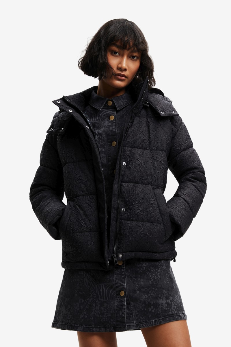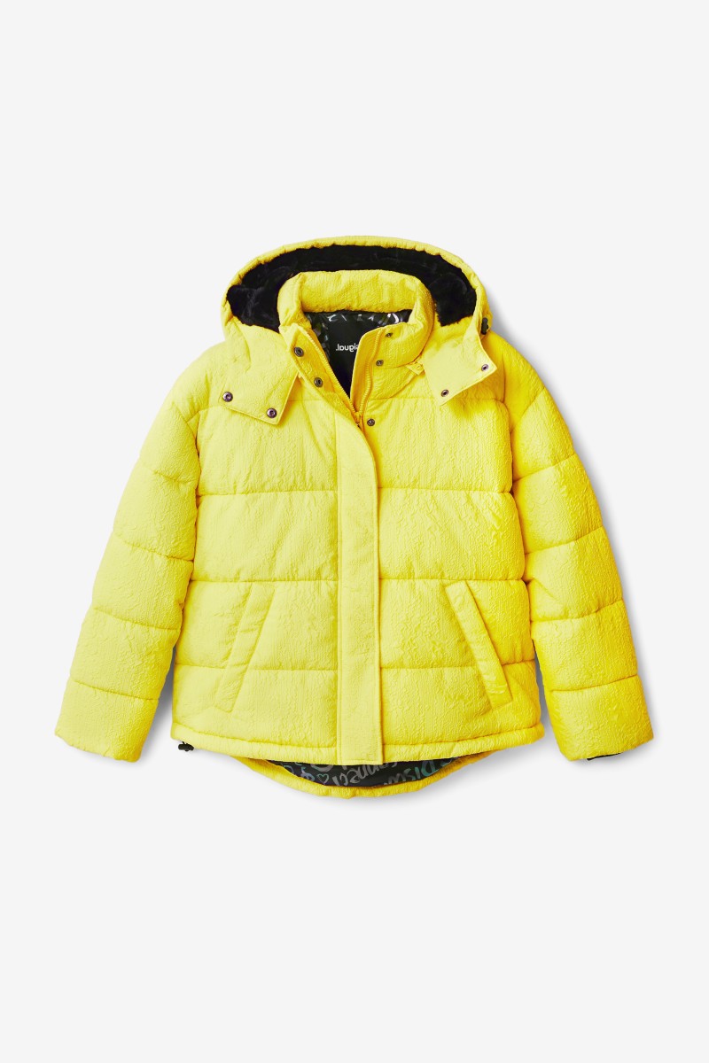 Tato prošívaná bunda je pohodlná a teplá, má kapuci, povrchovou úpravu z recyklovaných vláken a reliéfní abstraktní potisk.