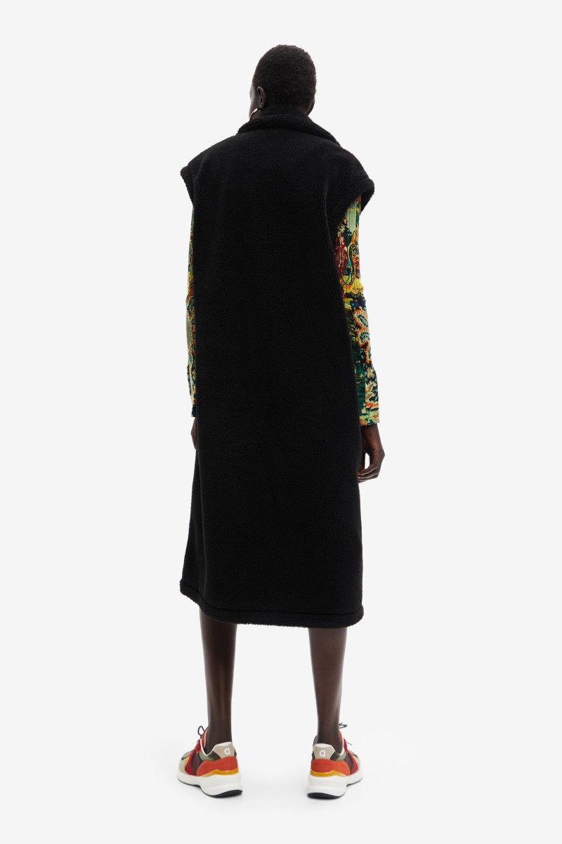 This vest is made of a warm wool fabric with a pleasant touch, it does not go unnoticed and is very easy to combine thanks to its straight cut, long length and collar with lapels.