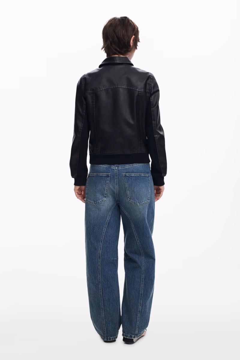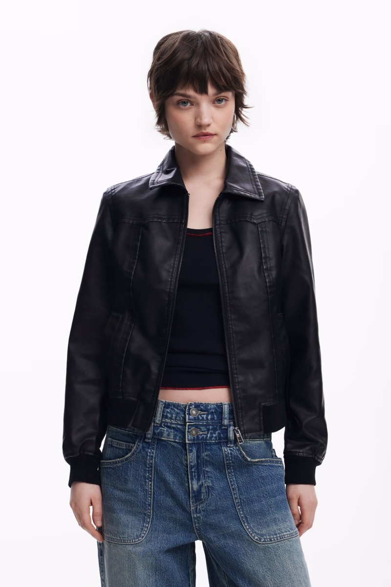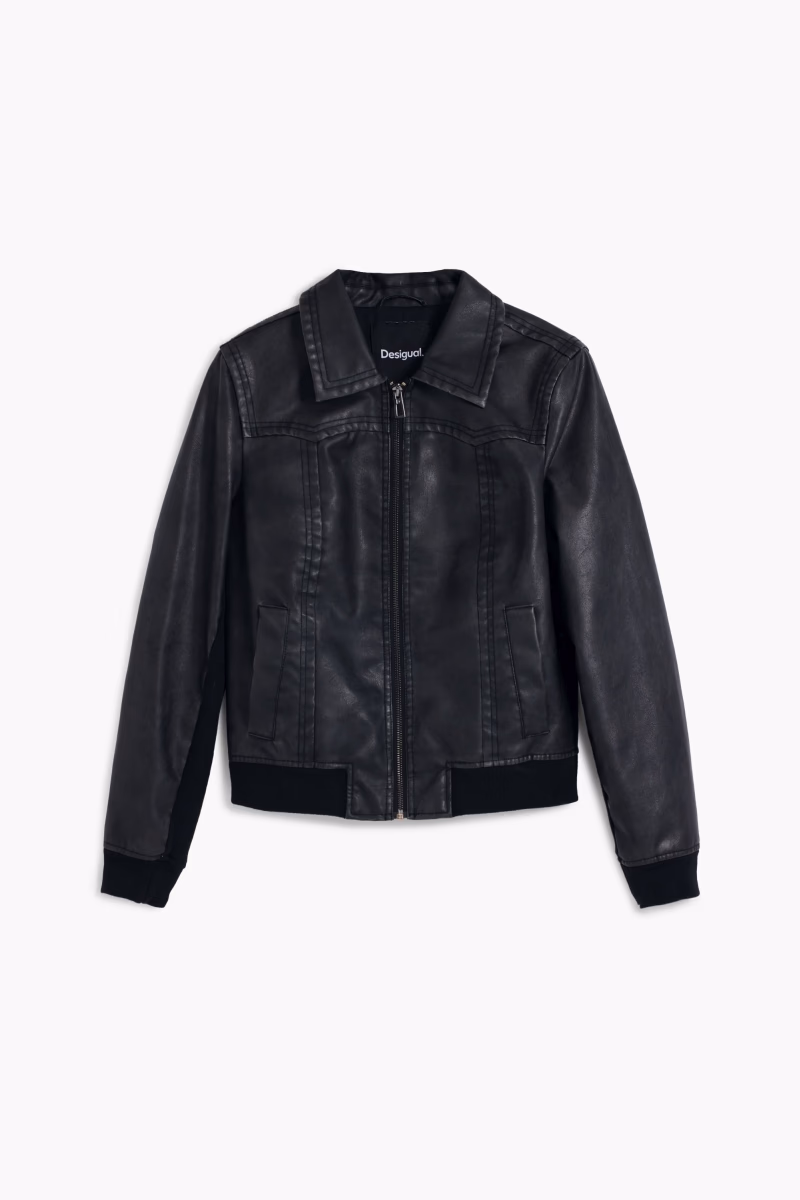 Biker jacket made of leather effect, collar, zip fastening, front pockets and rubber at the waist.
