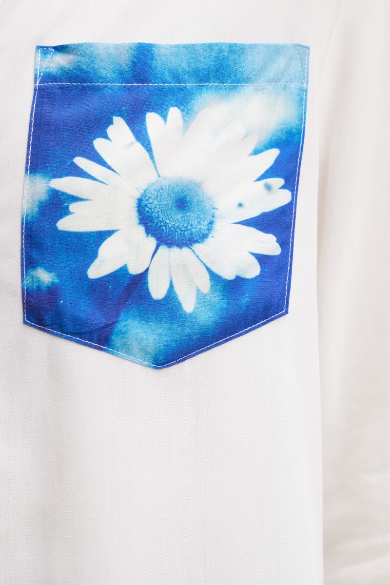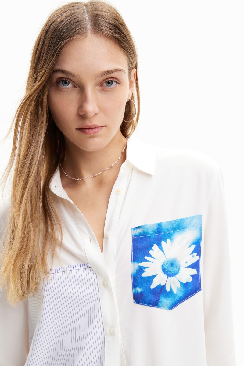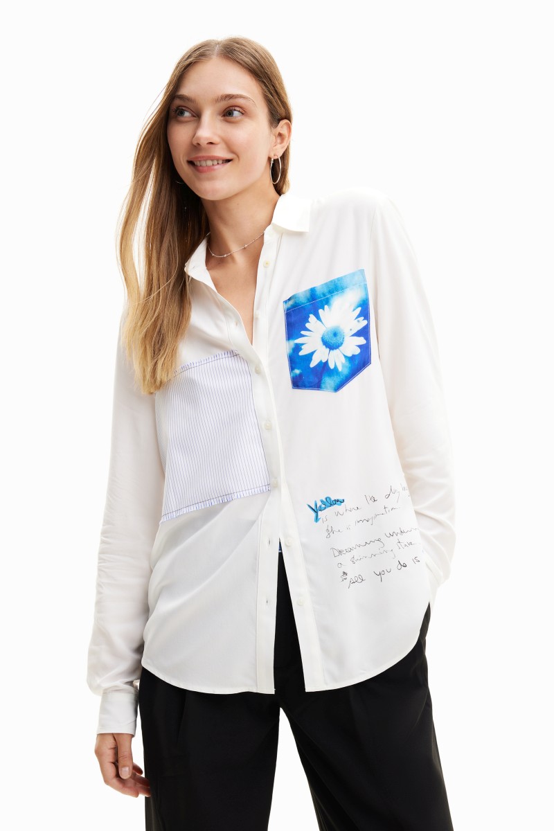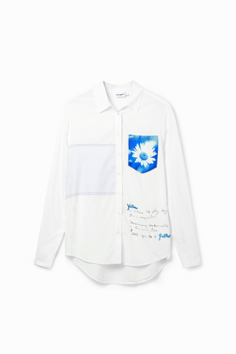 Jednoduchá košile s dlouhým rukávem s pruhovanou látkovou nášivkou, kapsou s potiskem květin a textovým detailem.