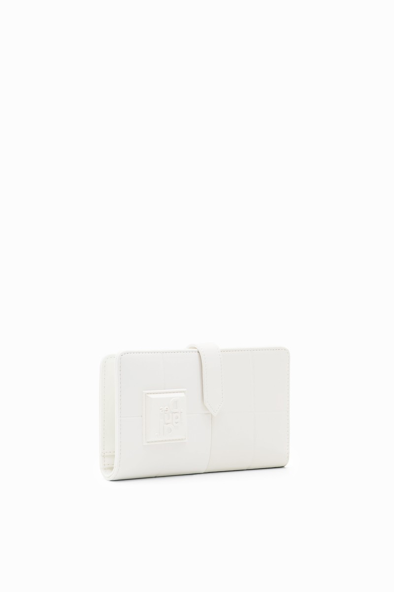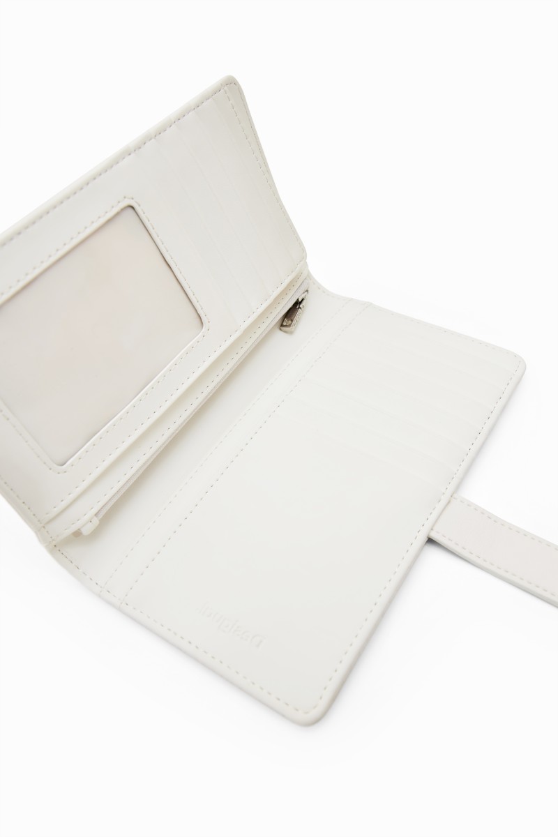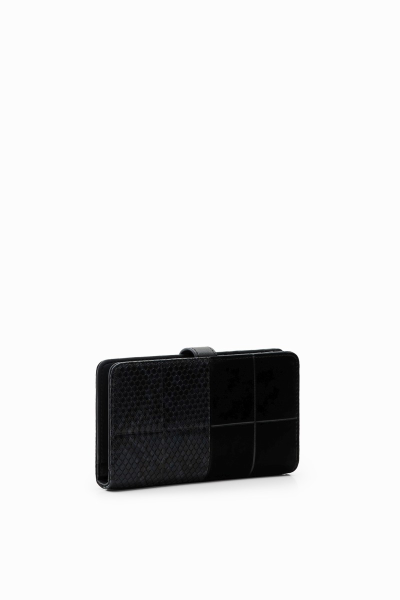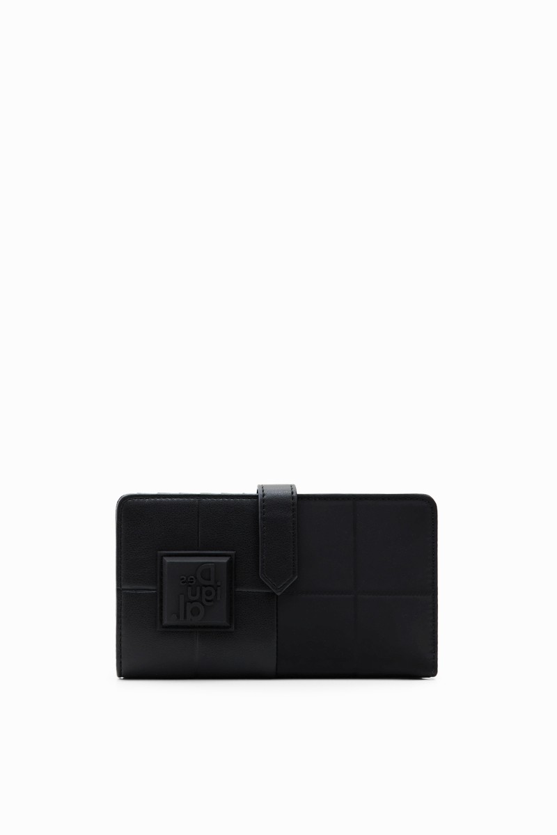 Peněženka střední velikosti s patchworkem z různých materiálů, vyraženým logem a několika přihrádkami.